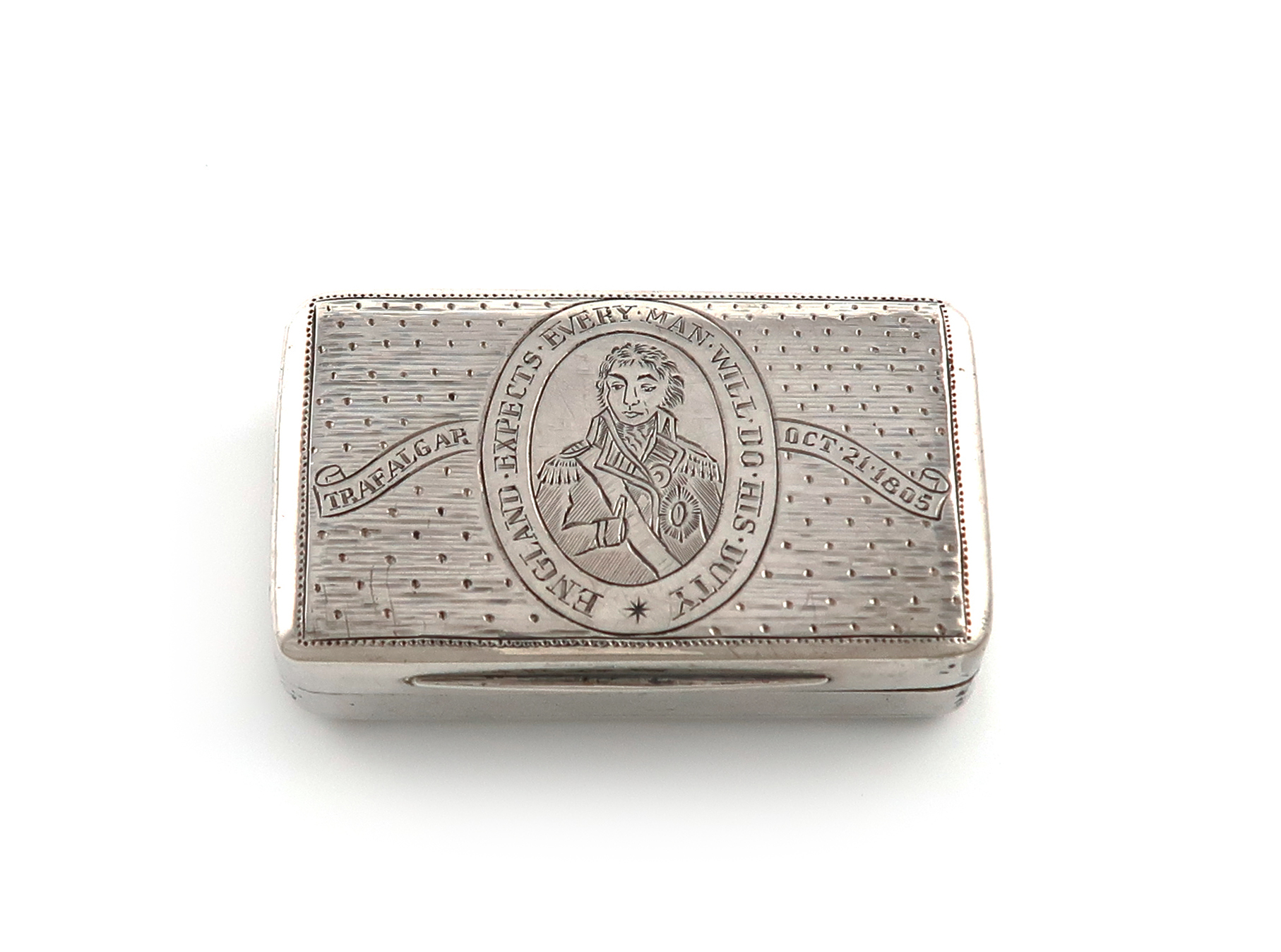 rectangular form, the hinged cover with an engraved portrait of Nelson within an oval border, inscribed 'England Expects Every Man Will Do His Duty', and with a banner 'Trafalgar Oct 21. 1805', with reeded and dot decoration, the base with similar decoration and with initials, plain thumb-piece, gilded interior, length 5.3cm, approx. weight 1oz.