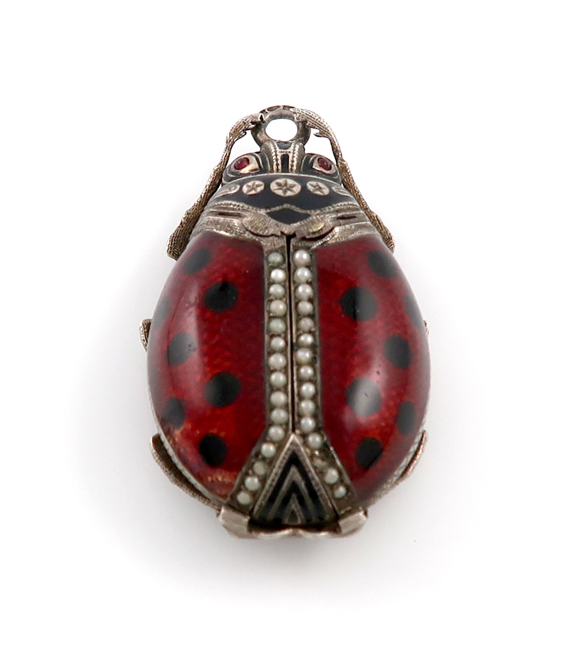 with sprung red and black enamelled wings, which open to reveal a grille with plain pierced decoration, the wings with seed pearl borders, (one pearl missing), the head with black enamel and set with two red eyes, the underside with textured legs, with a ring attachment, length 4.7cm.
