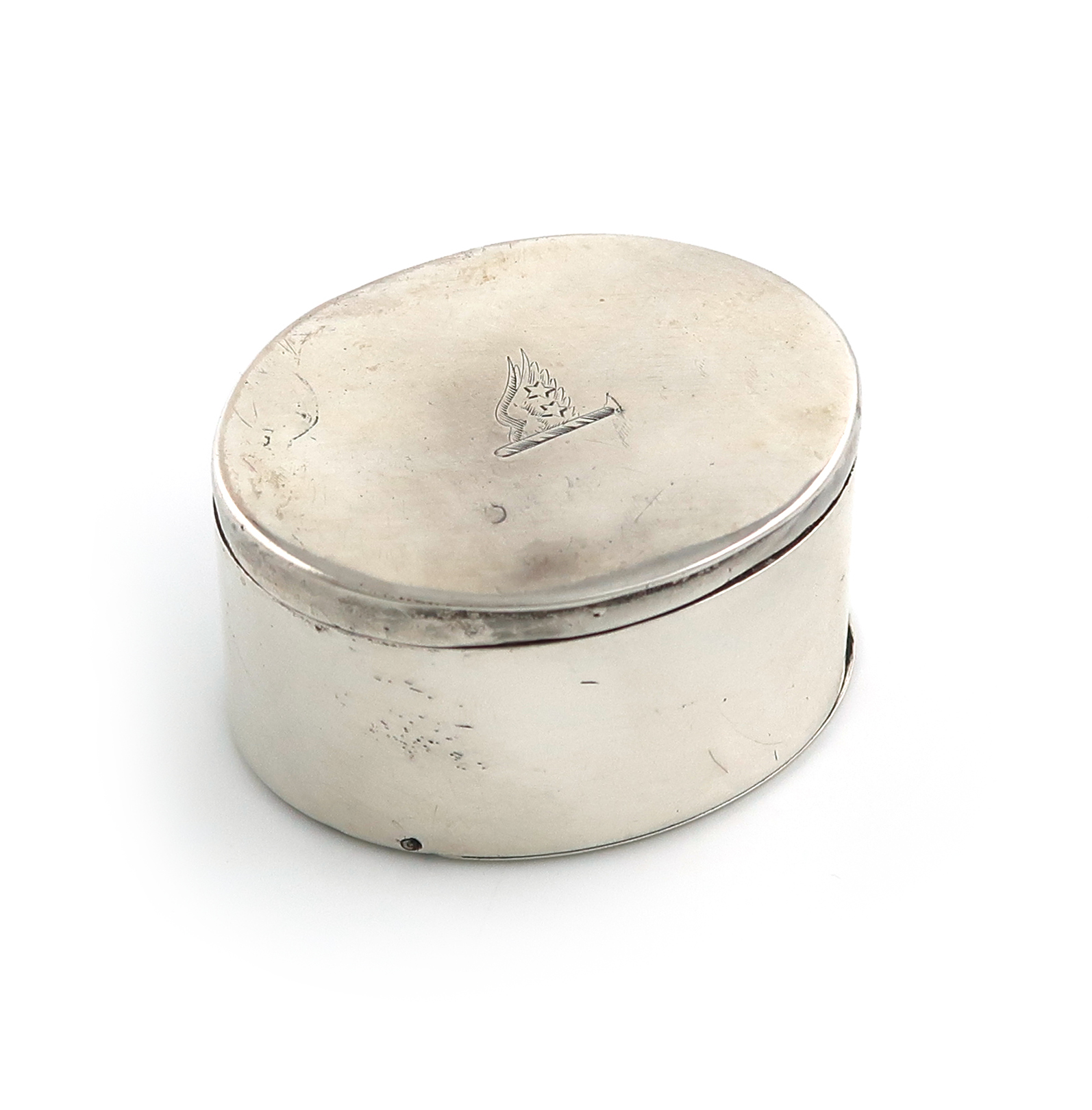 oval form, hinged cover and base, the interior with a steel grater, with an engraved crest to the cover, length 4.7cm, approx. weight 1.4oz.