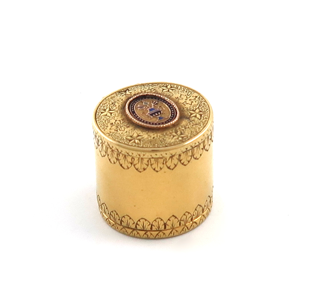 cylindrical form, chase foliate decoration and borders, the hinged cover enamelled with an urn of flowers, the base enamelled 'Don D'Amitie', the pull-out base opens to reveal a compartment, height 1.8cm, approx. weight 9.4g.