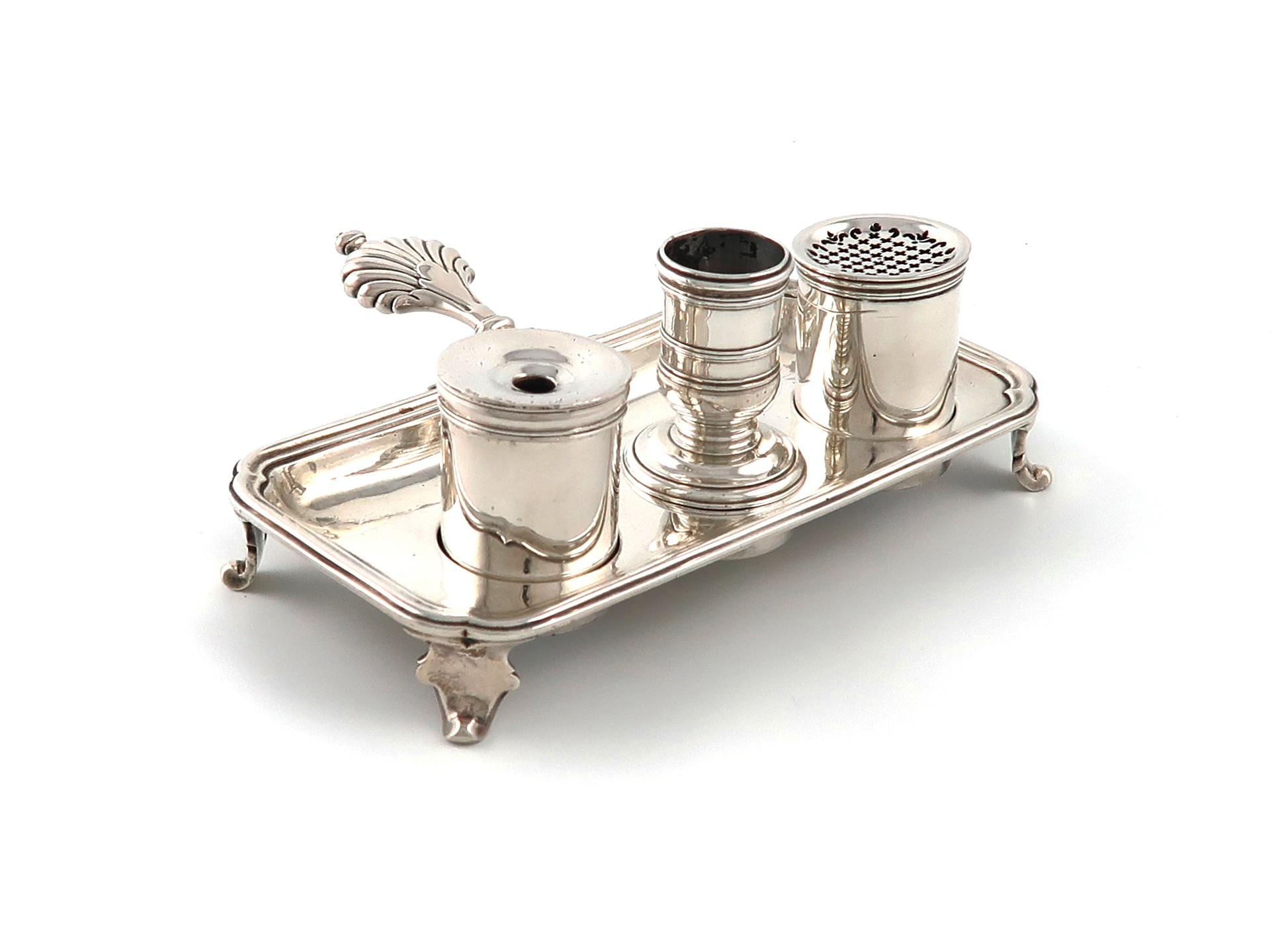 rectangular form, fluted carrying handle, with a pen tray and with an inkwell, (with an old Sheffield plated cover), a taper stick and a sander with a pierced cover, on four bracket feet, the underside engraved 'GR' and 81/2, length 14.1cm, approx. weight 8.5oz.
