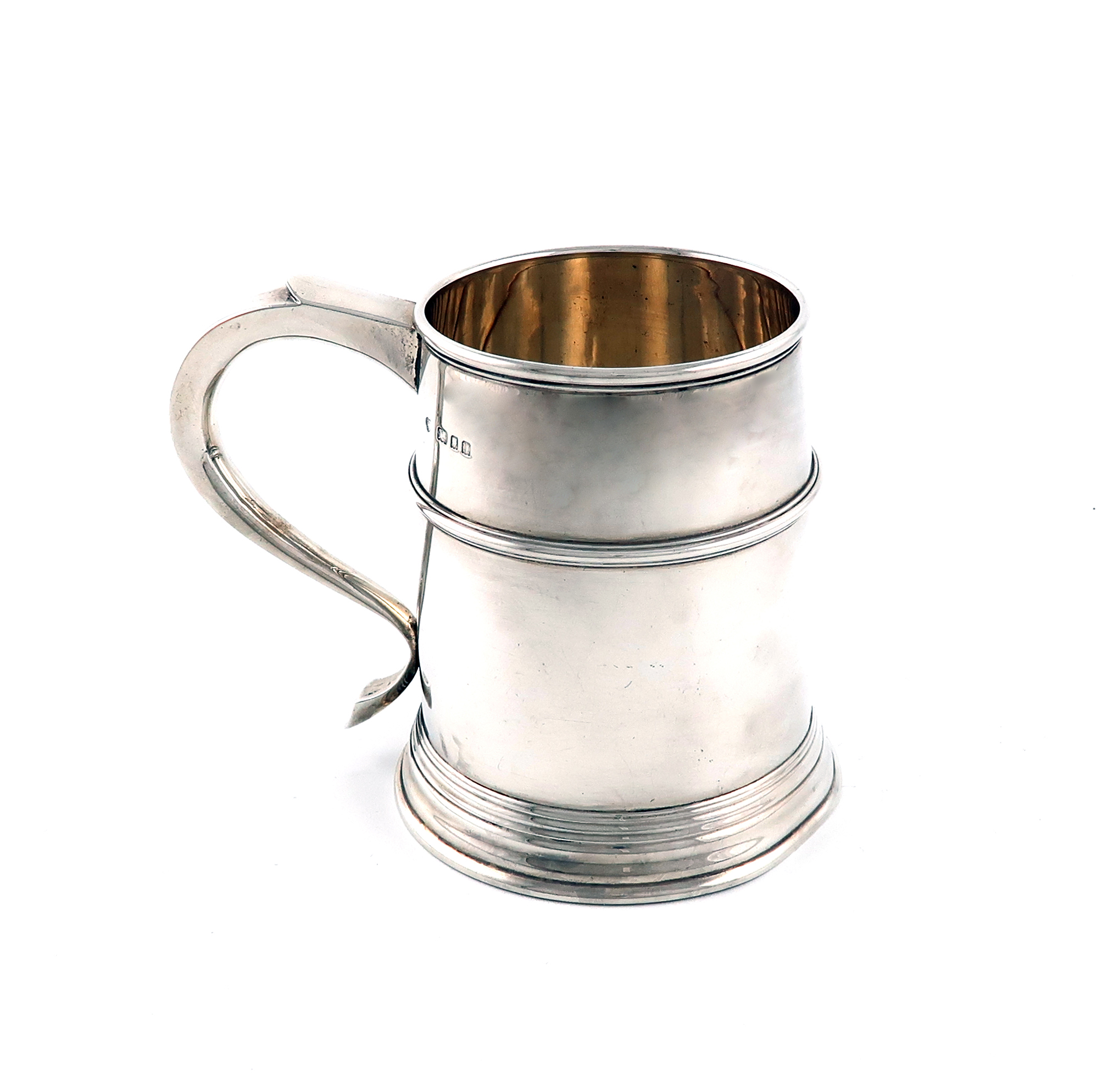 tapering circular form, central girdle, scroll handle, height 11.7cm, approx. weight 14.8oz.