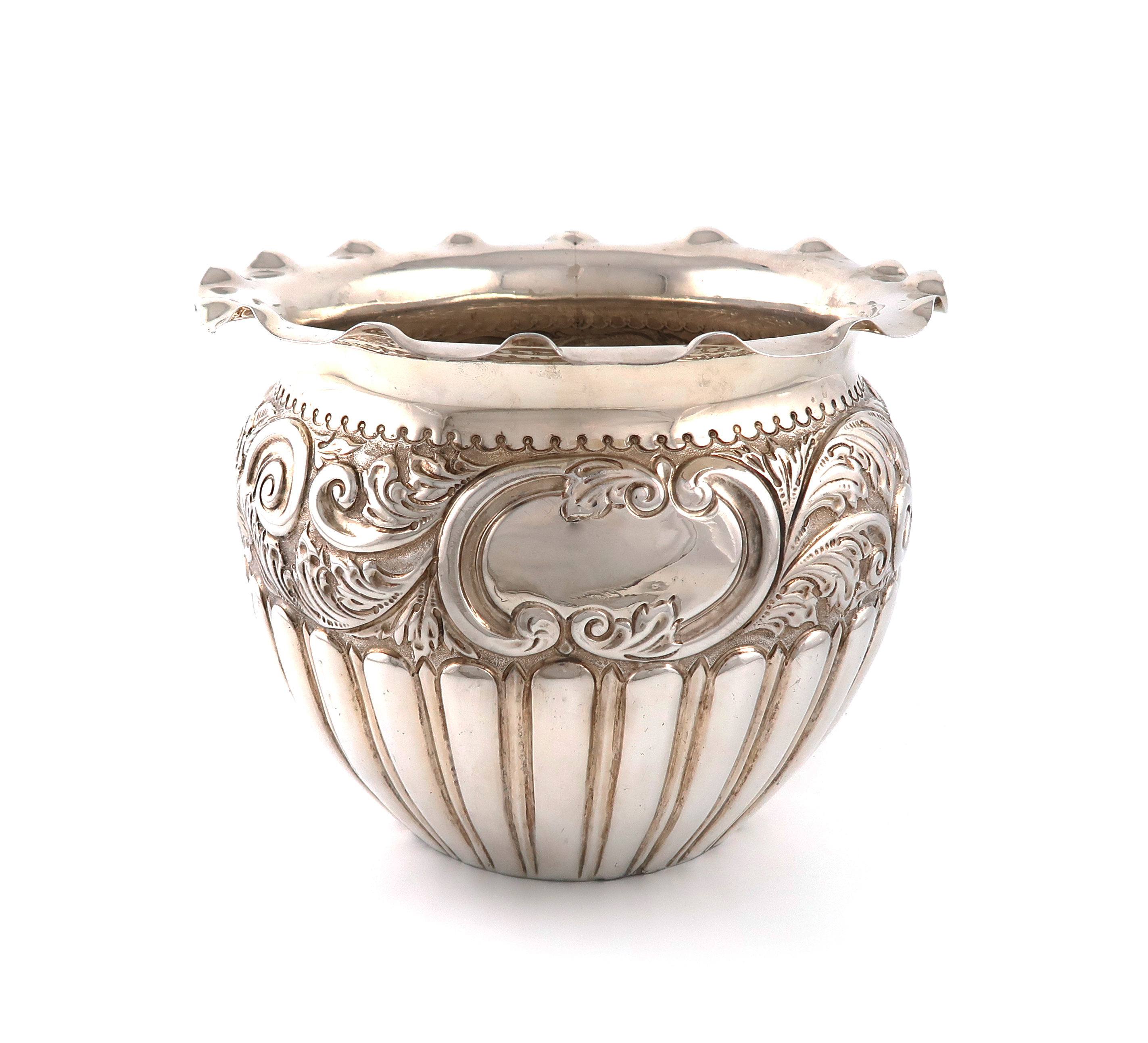 circular tapering form, with embossed with foliate scrolls above part-fluted decoration, crimped border, height 15.8cm, approx. weight 19oz.