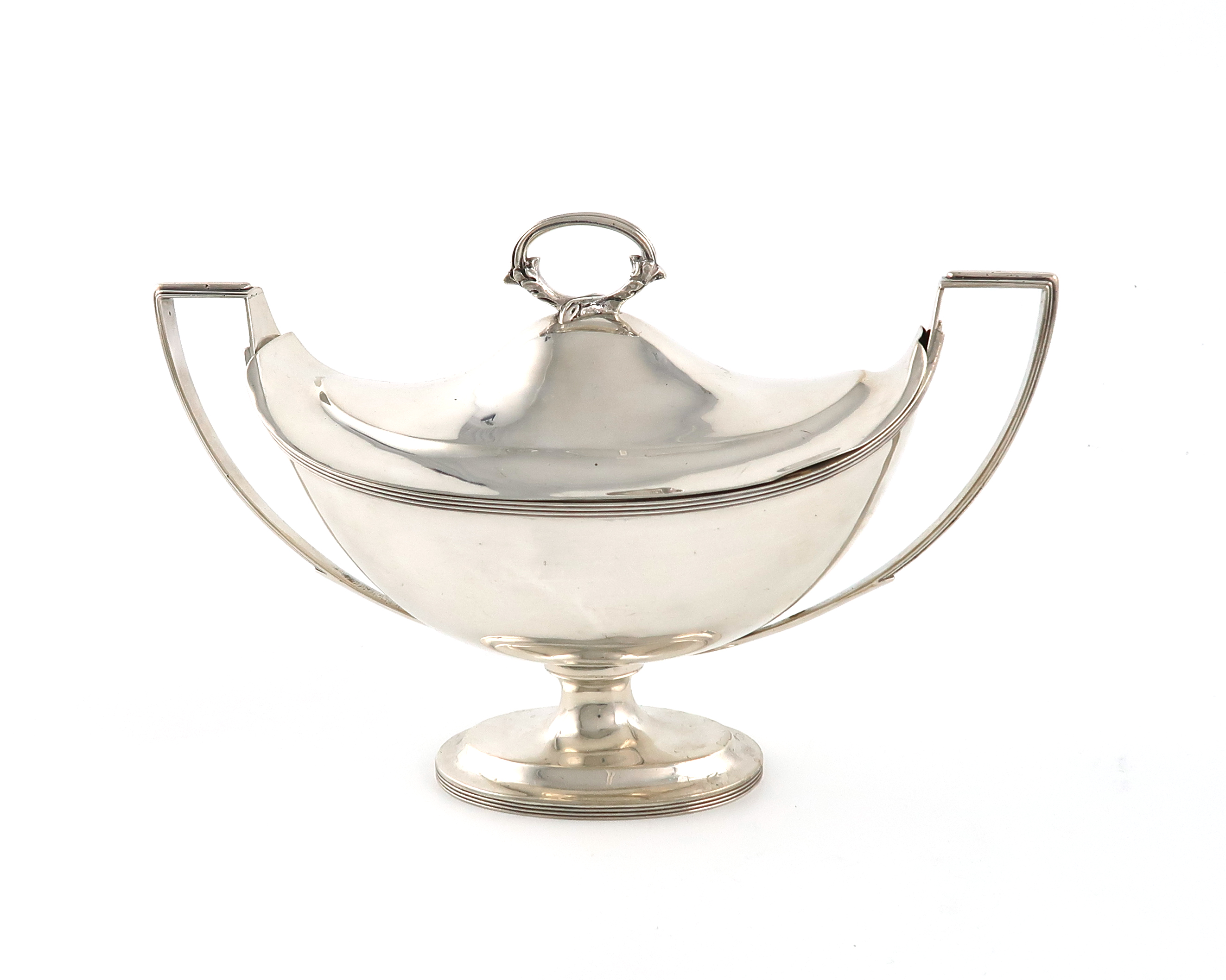 oval form, scroll handles, the pull-off domed cover with a reeded handle, on a raised oval foot, length 23.5cm, approx. weight 15.5oz.