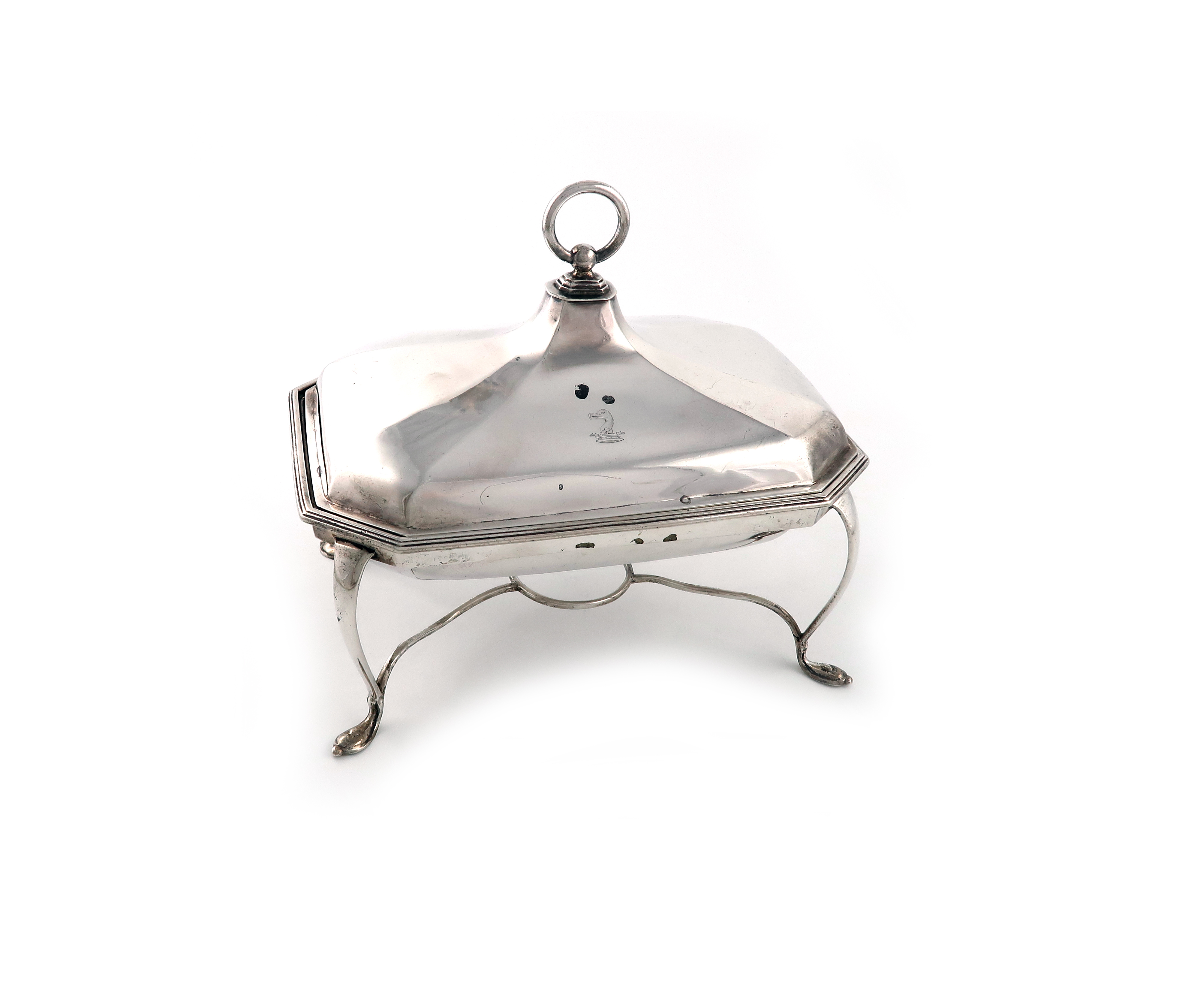 rectangular form, canted corners, the raised pull-off cover with a ring handle and engraved with a crest, the stand of wire-work form, on four scroll feet, lacking burner, length 26.1cm, approx. weight 46oz.