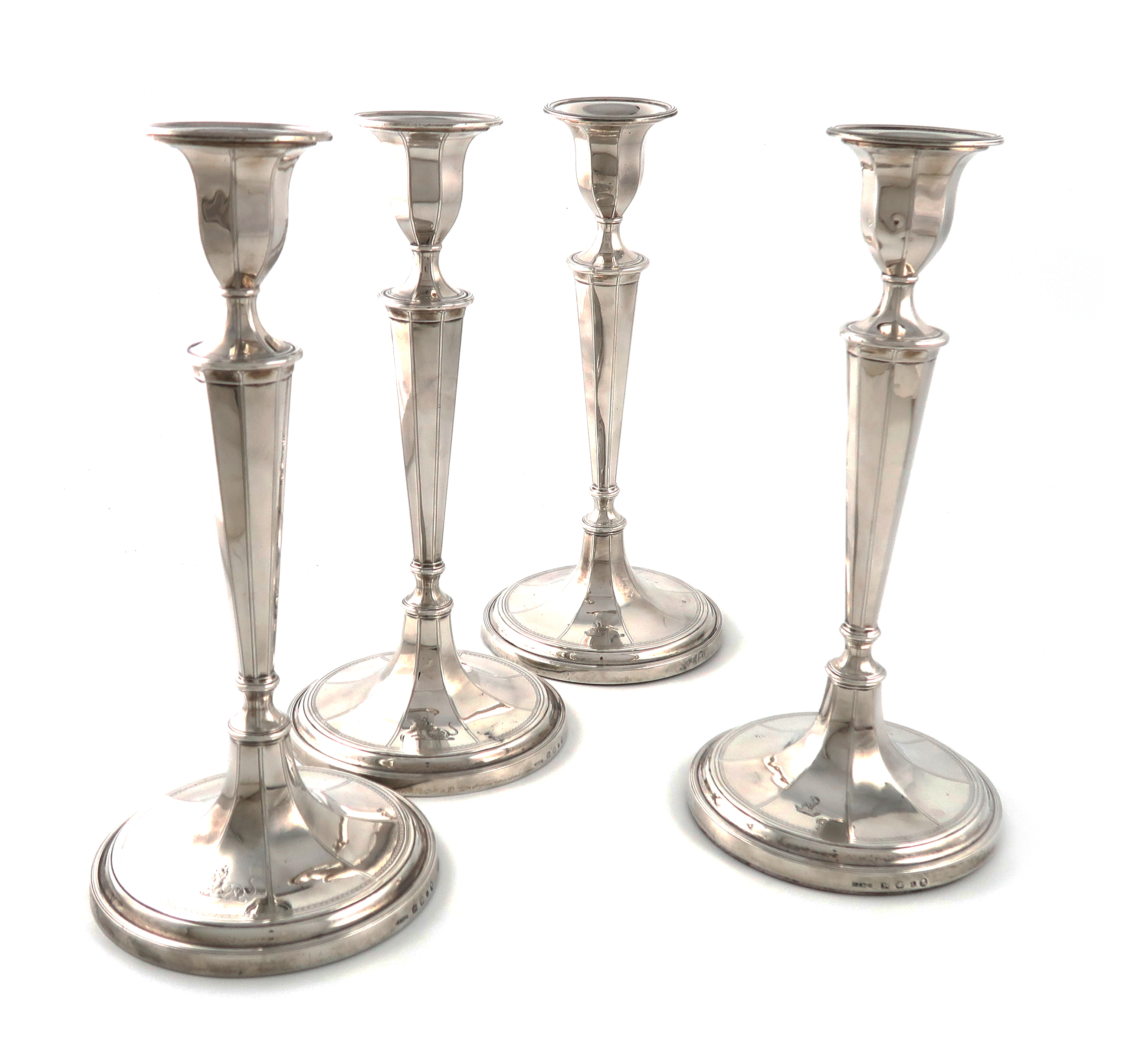 octagonal tapering columns and capitals, detachable drip pans, bright cut borders, on raised circular bases, engraved with two different crests to the bases, all loaded, height 29.8cm. (4)