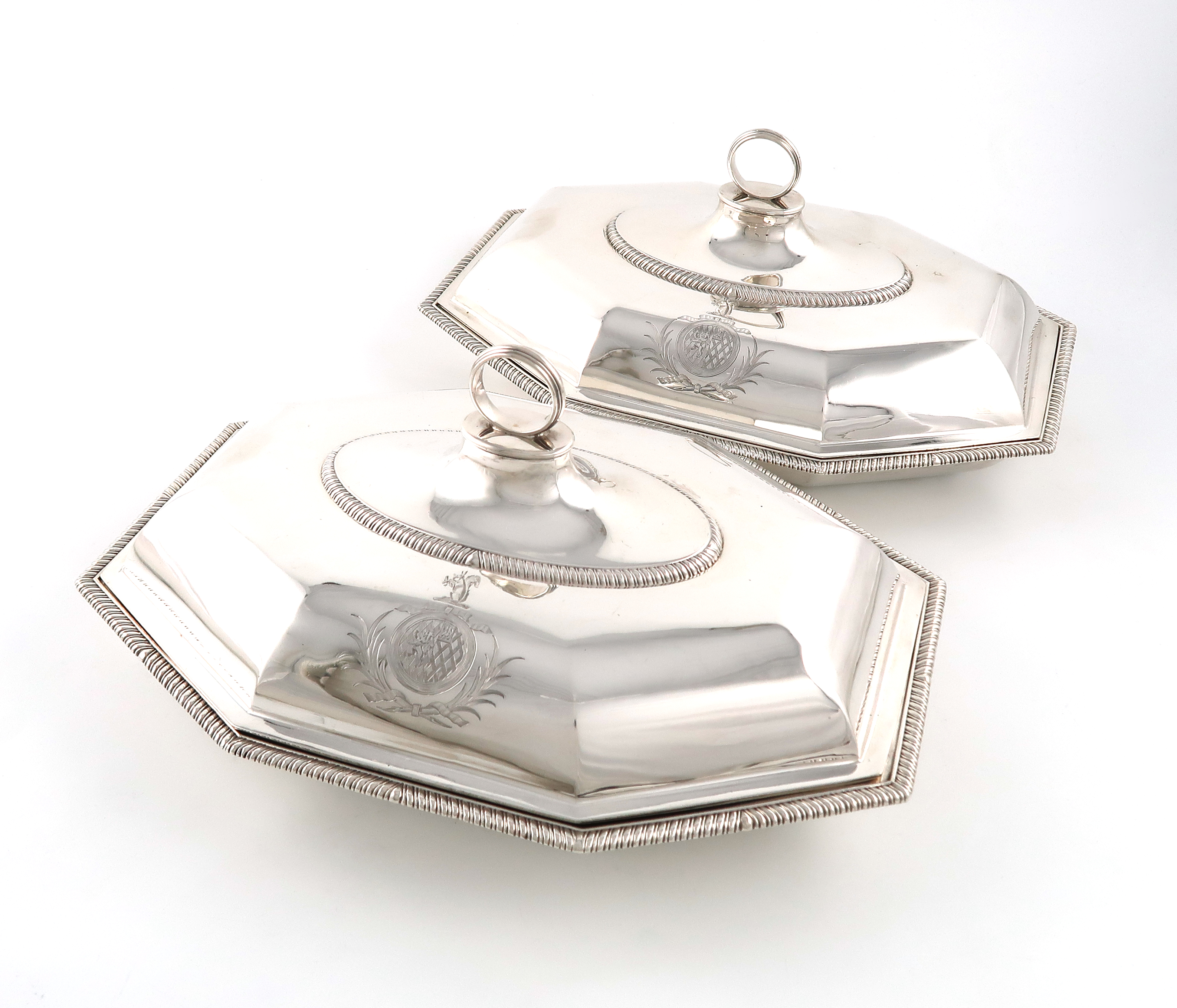 panelled shaped rectangular form, gadroon borders, the pull-off covers with a gadroon border and reeded ring handle, engraved with an armorial and crest, the bases numbered 2 and 4, the covers numbered 1 and 3, length 31cm, approx. weight 85oz. (2)