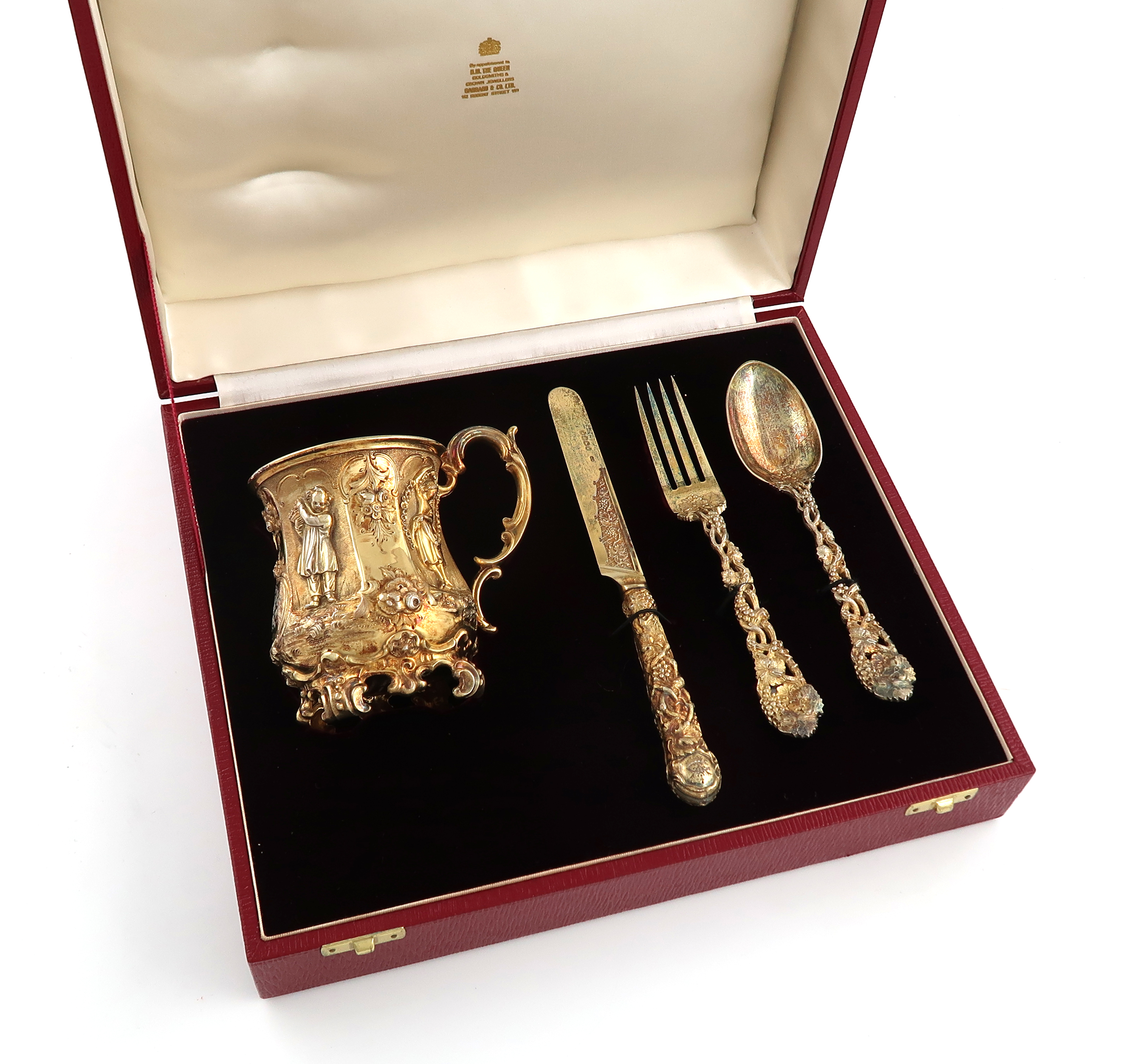 comprising: a cup with embossed scroll foliate decoration and four embossed children motifs, engraved initials to central cartouche, on four scroll feet, with a pierced Vine pattern knife, fork and spoon with engraved initials, in a later fitted case, retailed by Garrard and Co., total approx. weight 14.7oz. (4)