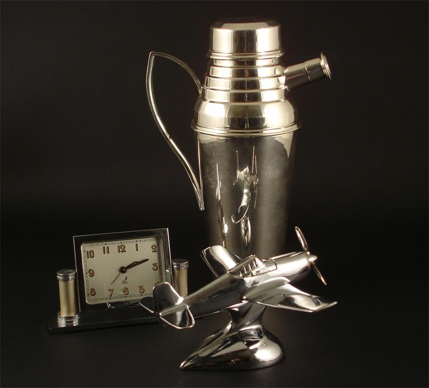 An Asprey electroplated metal Novelty cocktail shaker an American plated lighter modelled as Mustang plane, a Jaz desk clock and a cigarette case stamped marks to shaker 26cm. high