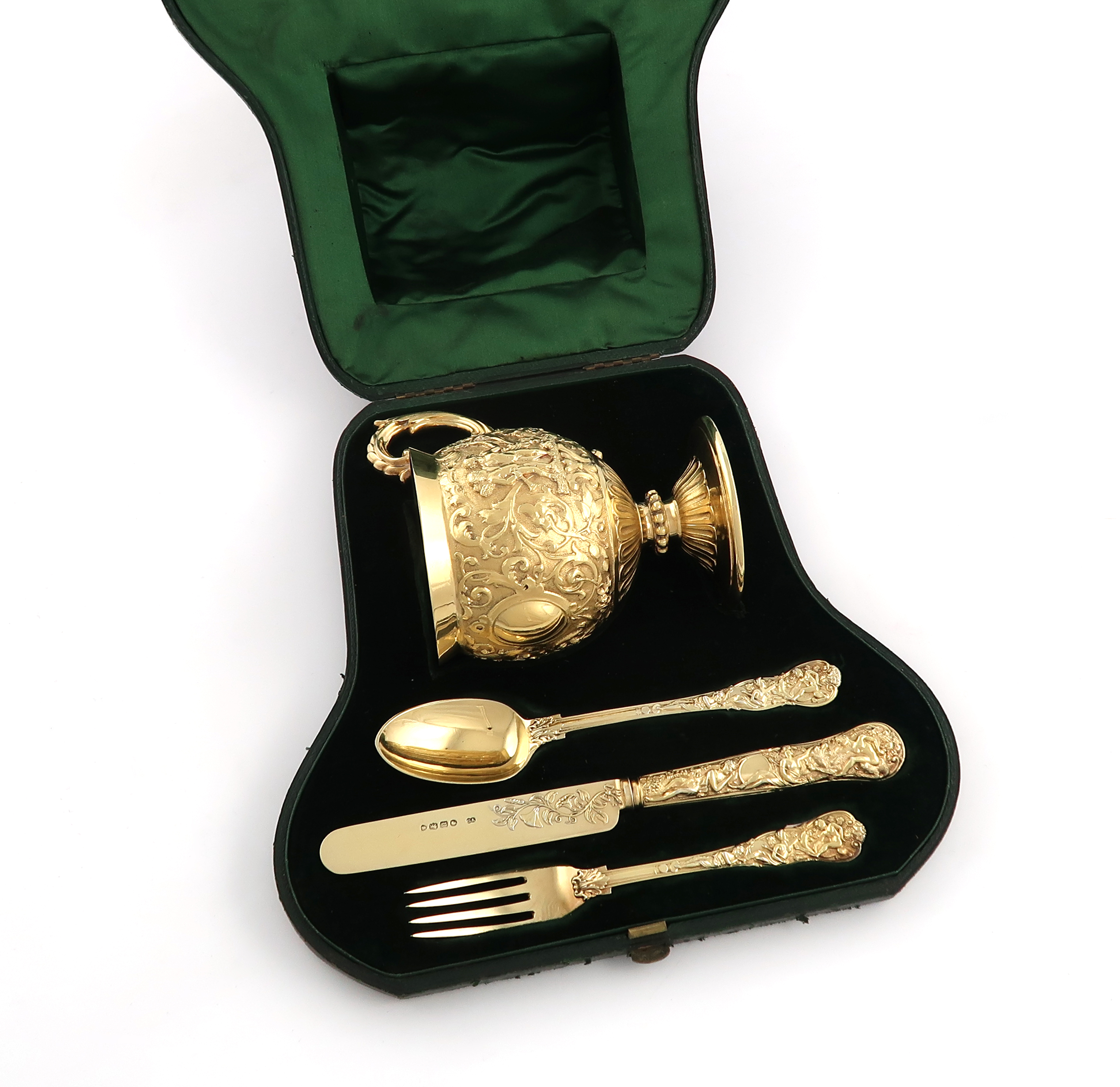 comprising: a cup of circular form on a raised circular foot, scroll form handle, embossed scroll foliate and cherub decoration on a matted background, with a vacant cartouche, with a Bacchanalian pattern knife, fork and spoon, in a fitted velvet lined case, total approx. weight 11.5oz. (4)