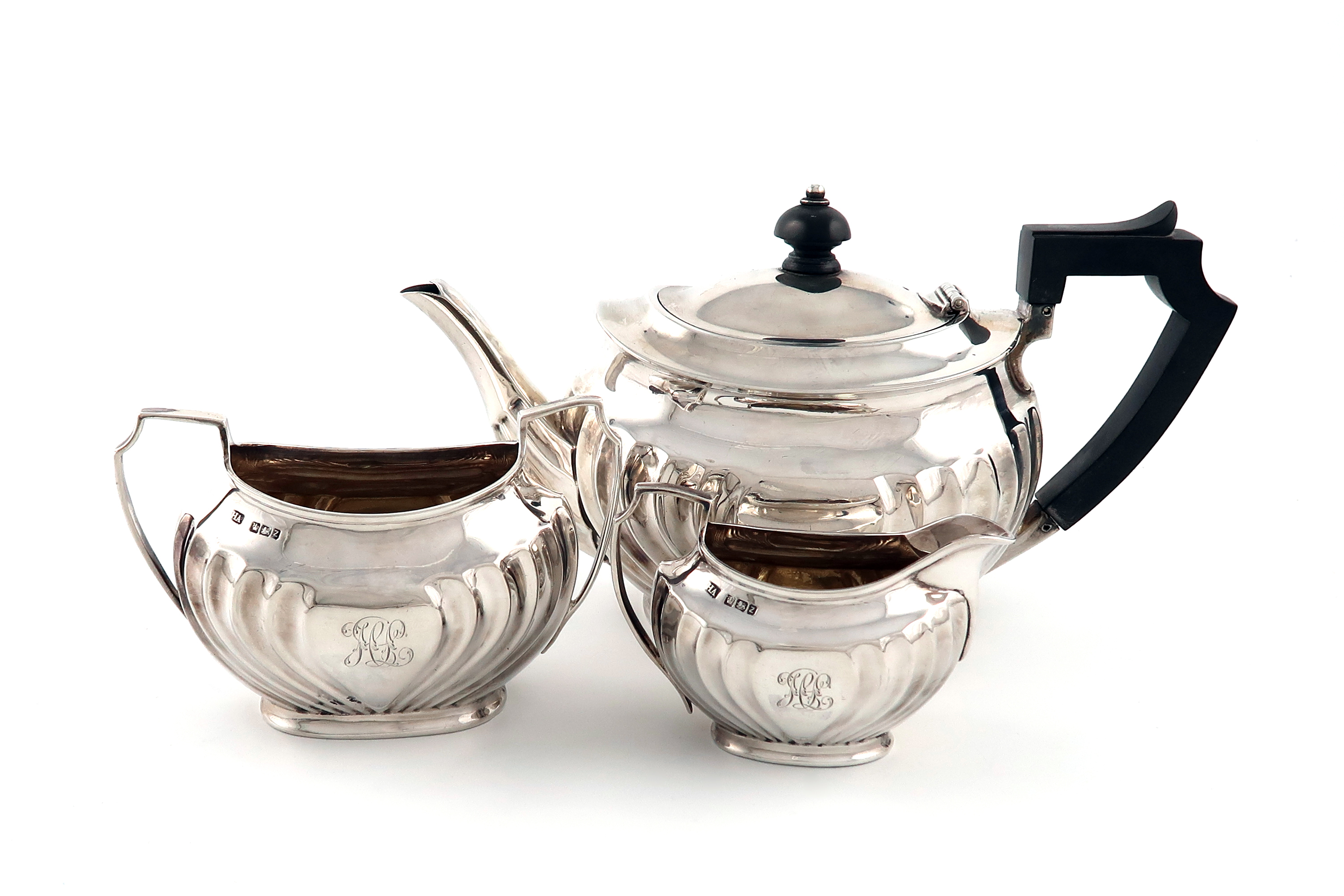 oblong bellied form, part fluted decoration, scroll handle, engraved initials, length handle to handle 23.8cm, approx. weight 21.6oz. (3)