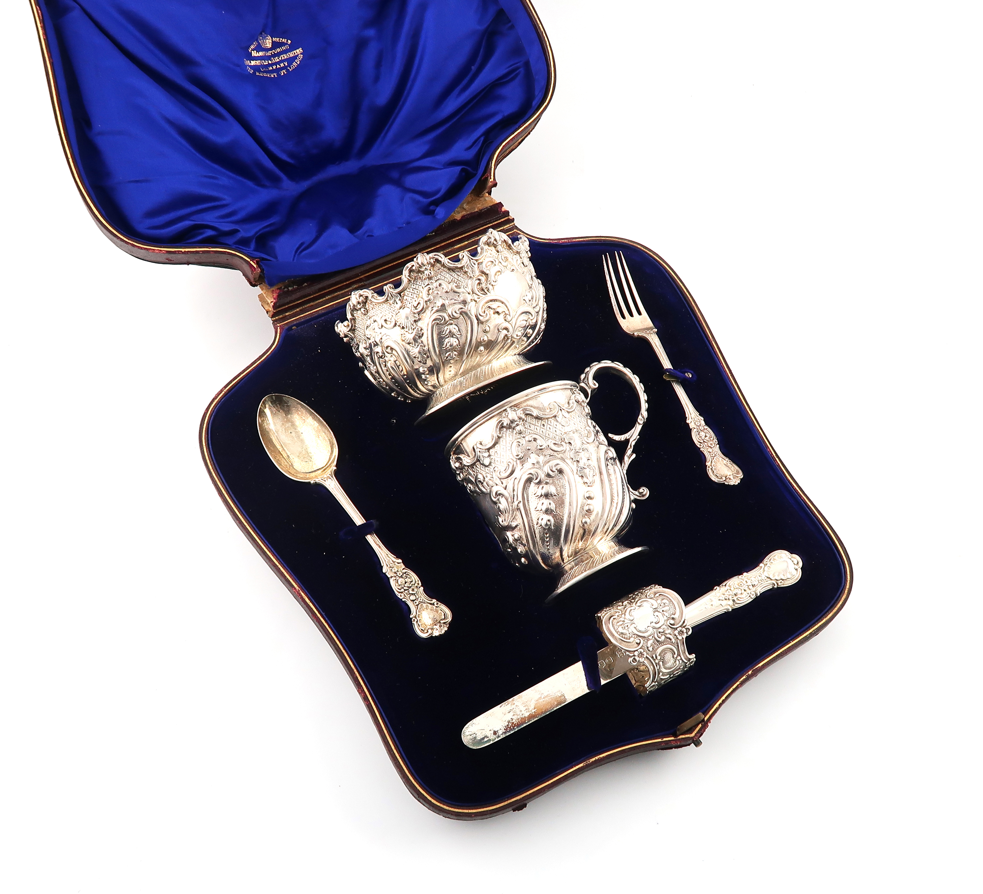 comprising: a mug with embossed scroll and foliate decoration with a vacant cartouche, scroll handle with gilt interior, a bowl with embossed scroll and foliate decoration with gilt interior, a napkin ring with embossed scroll and foliate decoration, with a fork, knife and spoon with scroll and foliate decoration, the knife handle by John Aldwinckle & Thomas Slater, in a fitted case, case a.f, total approx. weight 18.9oz. (6)