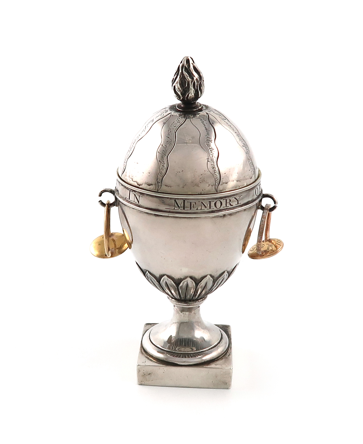 A George III silver Memorial Tontine urn with two Memorial rings,