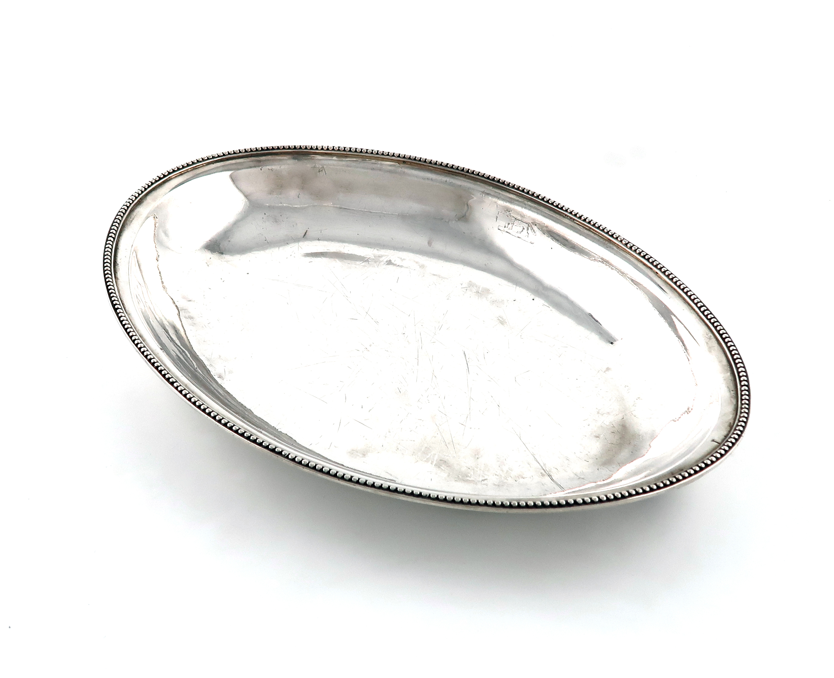 plain oval form, beaded border, lacking handles, the underside with names of men and women, the dates of their death and the ages they died, length 32cm, approx. weight 17.2oz.