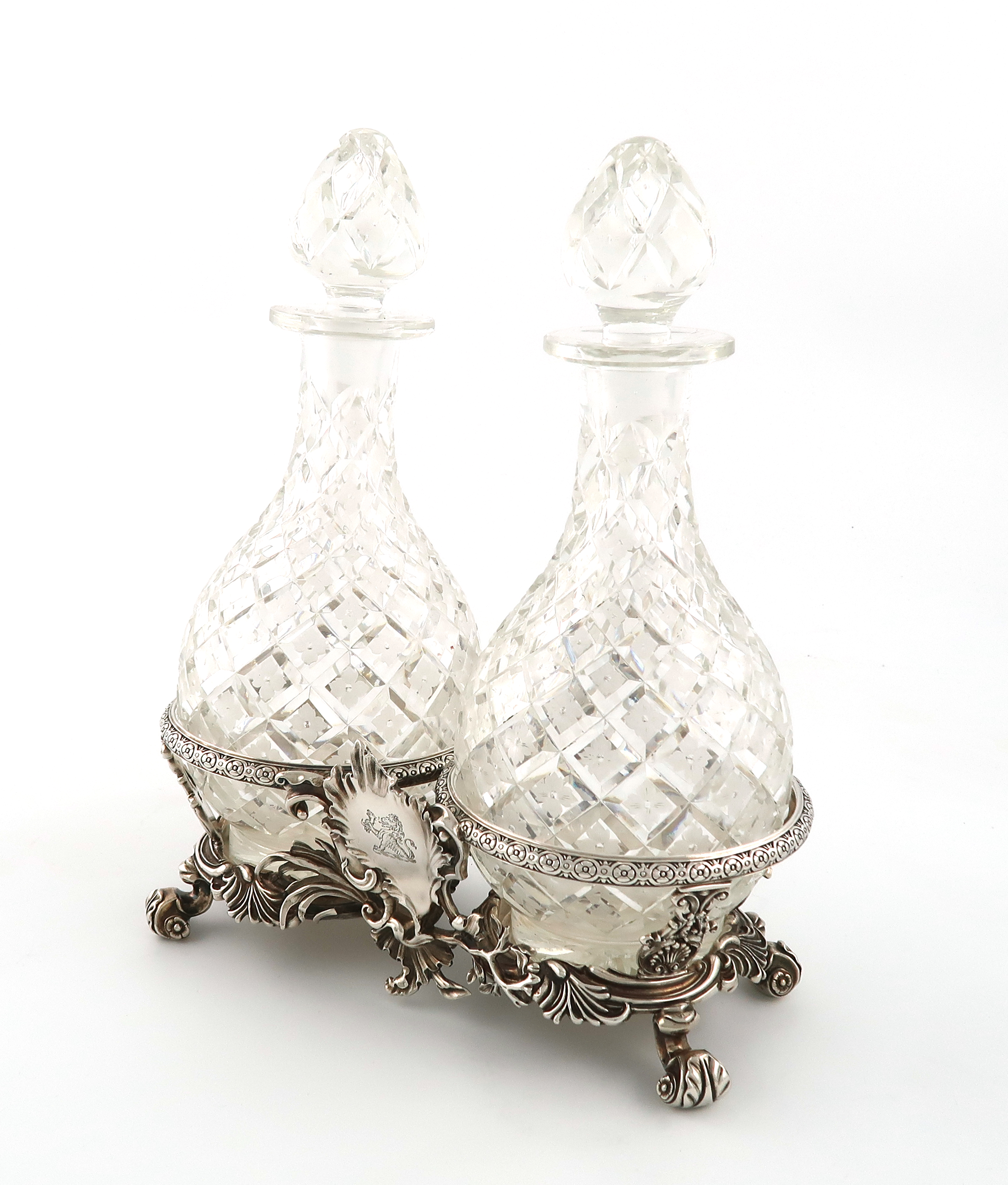 double circular form, with scroll foliate and shell decoration, foliate scroll handle, with a central shell and foliate cartouche with an engraved crest, leaf capped scroll handle, on four scroll foliate feet, with two later glass decanters, length 24cm, total approx. weight 28.3oz. (3)
