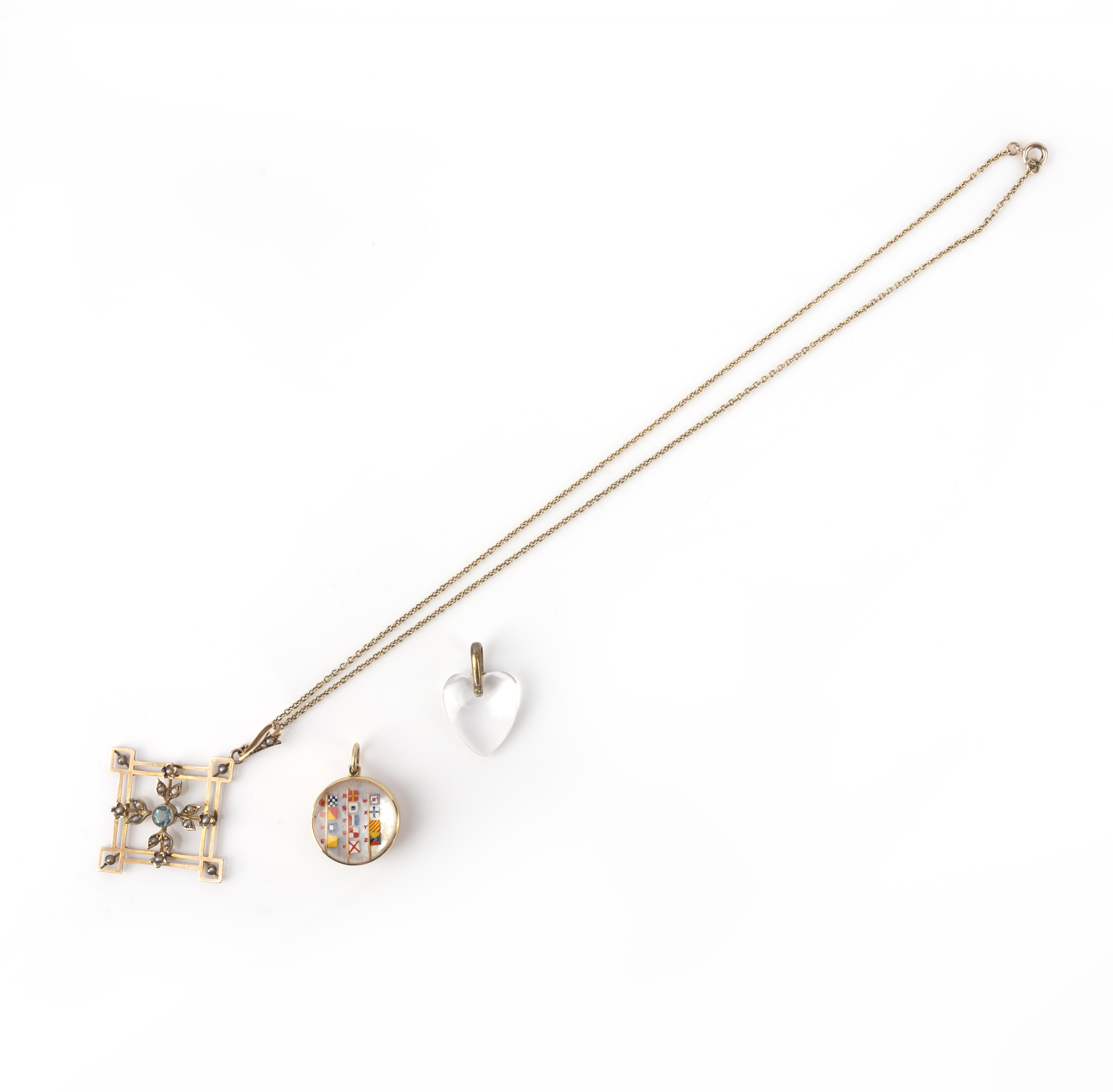 A group of three pendants, early 20th century, comprising: a double-sided rock crystal reverse intaglio pendant with the alphabet in international maritime signal flags, backed in mother of pearl, mounted in gold, length 2.7cm; a heart-shaped rock crystal pendant, length 2.4cm, fitted case stamped Peake, dated 1912; and a gold pendant of geometric design centred on a circular-cut aquamarine issuing foliate motifs set with seed pearls, to a fine belcher link chain, pendant length 4.9cm including bail, necklace length 41cm, case