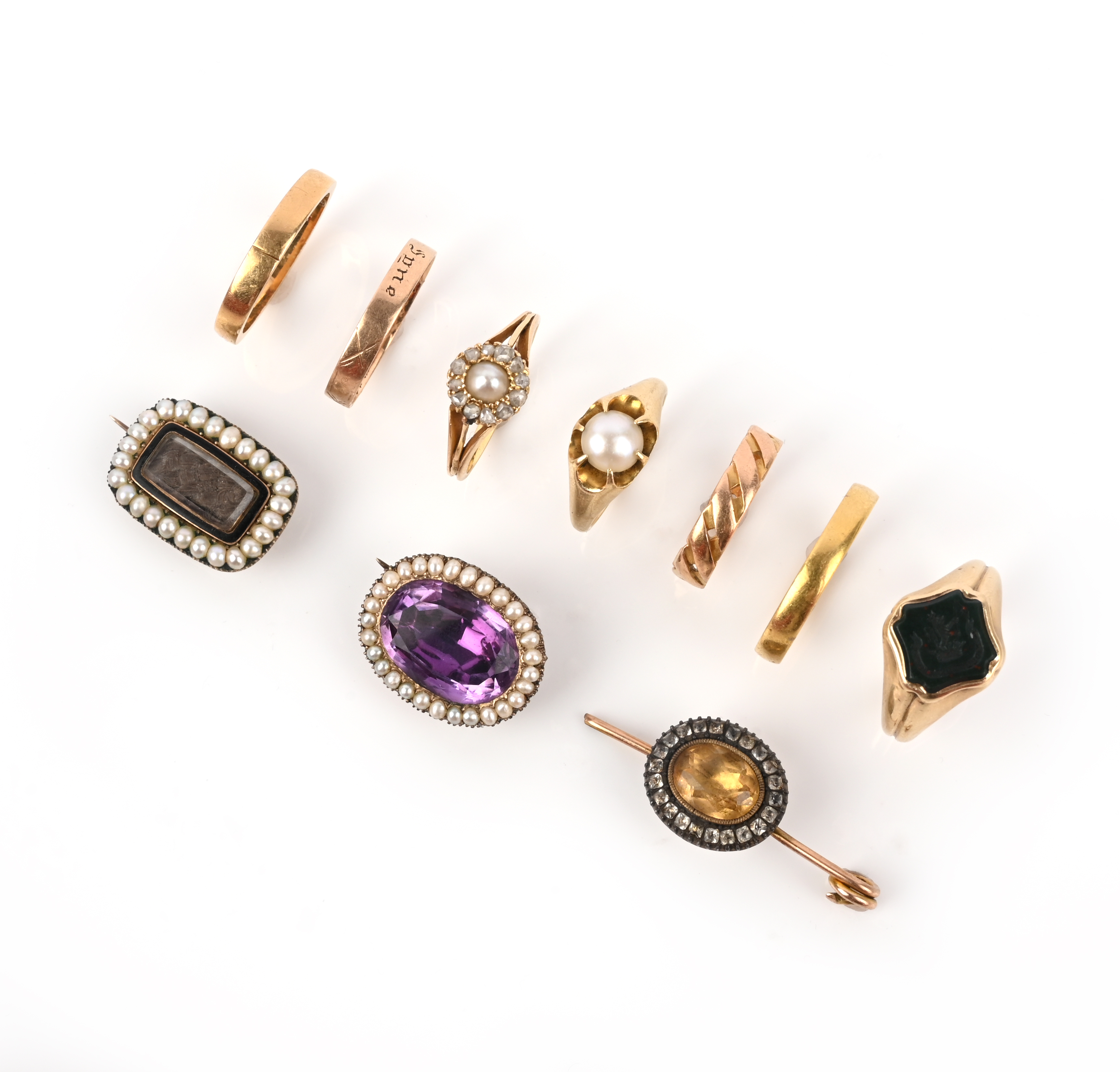 A group of jewels, comprising: a bouton pearl ring, size K; a half pearl and rose-cut diamond cluster ring, size P; an 18ct gold wedding band, size P1/2, British hallmarks; three gold bands, one inscribed Auld Lang Syne and dated 1853, maker's mark WW, sizes M1/2-Q1/2; a bloodstone signet ring engraved with a family crest, size N1/2; a hairwork and seed pearl mourning brooch dated 1832; an early 19th century amethyst and seed pearl brooch; and a yellow and colourless paste brooch, pearls untested, jewellery case stamped Hawley & Son, 289 High Holborn