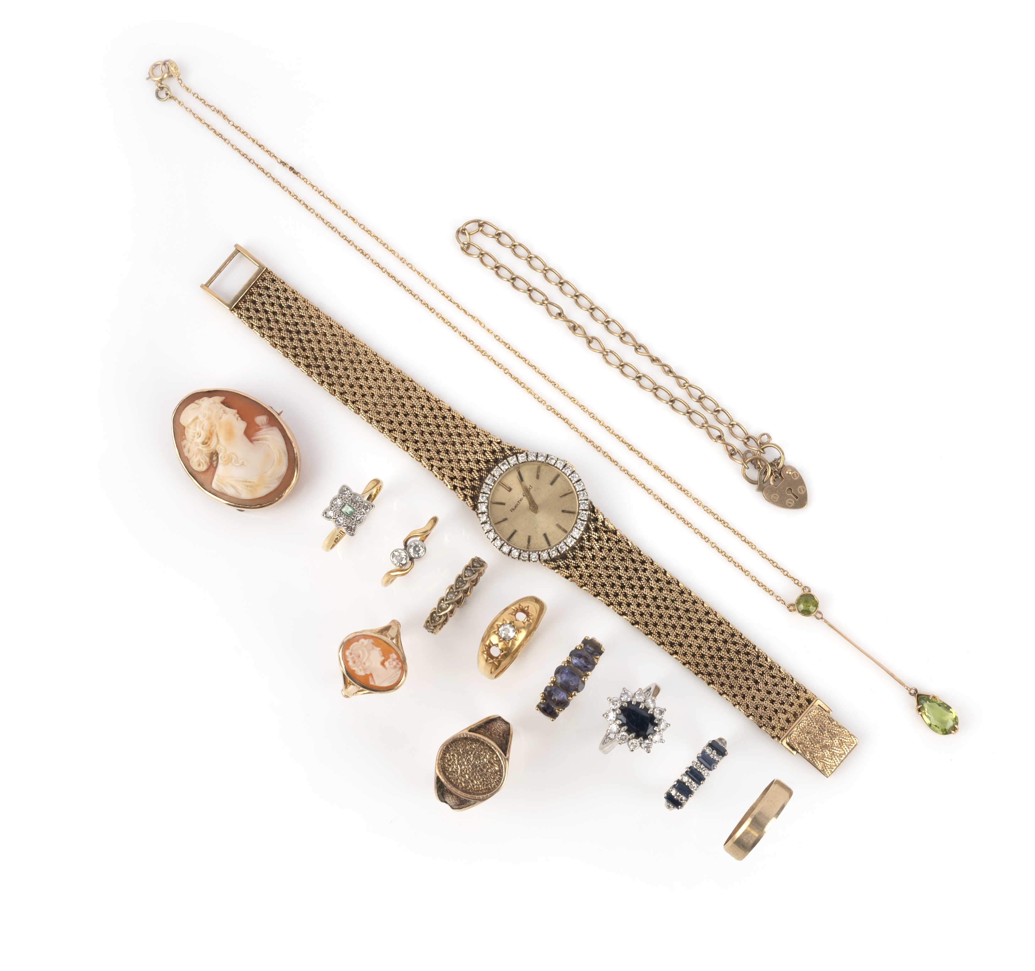 A group of jewellery, comprising: a lady's 9ct gold and diamond wristwatch by Beuche-Girod, manual winding movement, British hallmark; a sapphire and diamond cluster ring, size I1/2; a sapphire five-stone ring, size M; a baguette sapphire and diamond ring, size J; a millegrain-set emerald and diamond cluster ring, size O1/2; a 18ct gold ring star-set with a cushion-shaped diamond, size P1/2; side stones deficient; a diamond eternity ring, size K1/2; a diamond toi et moi ring, size L1/2; a 9ct gold wedding band, size Q1/2, British hallmarks; a textured gold signet ring, size P; a conch shell cameo and ring; a knife wire peridot pendant necklace, pendant length 4.5cm, necklace length 38cm; and a 9ct gold charm bracelet, British hallmarks