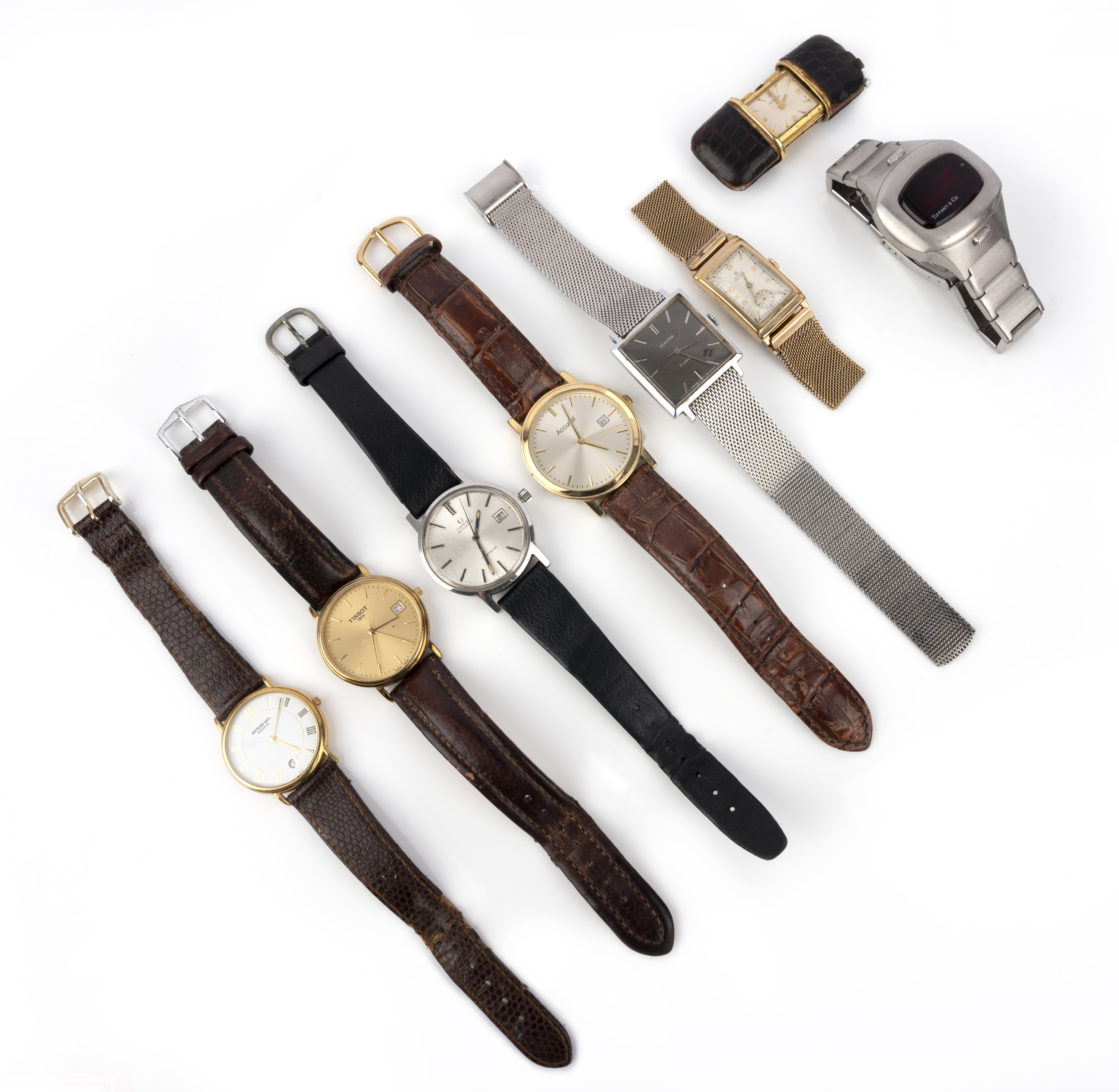 Seven gentleman's wristwatches and one travel watch, comprising: a 9ct Rolex watch, dial 2.2 x 1.6cm, numbered 52217 and 1936, Swiss assay marks; a stainless steel watch by Omega, a leather and gilt metal travel watch by Movado; a stainless steel automatic wristwatch by Seconda; three quartz watches by Tissot, Accurist and Raymond Weil; and a digital Pulsar watch by Tiffany & Co, numbered 224004