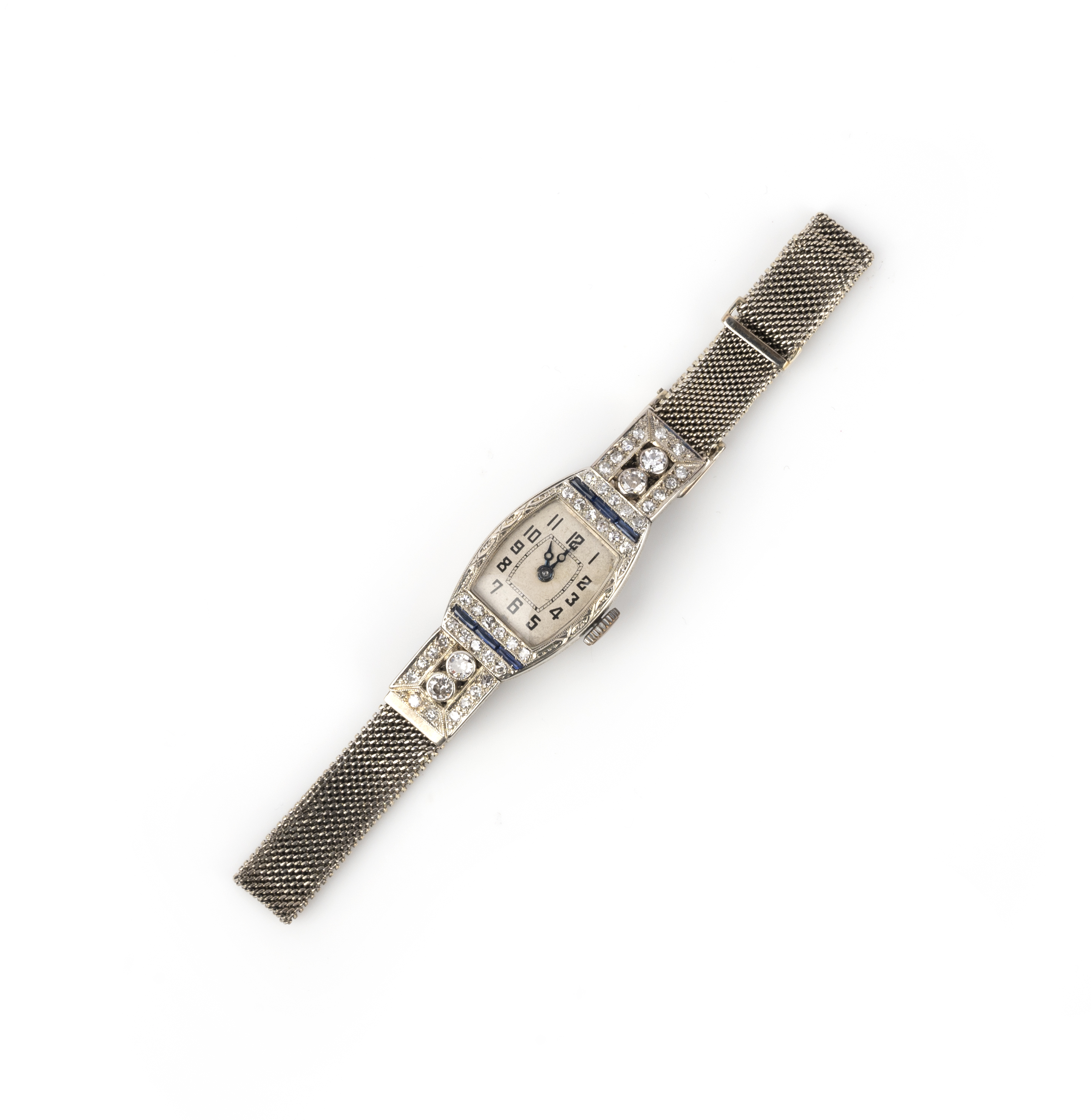 Rolex, a lady's diamond and synthetic sapphire Art Deco wristwatch, 1920s, the tonneau-shaped silvered dial with black enamel indicators and blued steel hands, to a tonneau-shaped case of geometric design set with single-cut diamonds and calibré-cut synthetic sapphires, to a white gold mesh strap, dial measuring 1.4 x 1.2cm, manual winding movement and interior of case signed Rolex, British import hallmark for 18ct white gold, Glasgow, numbered 112 8399, later adjustable strap stamped 18CT white gold