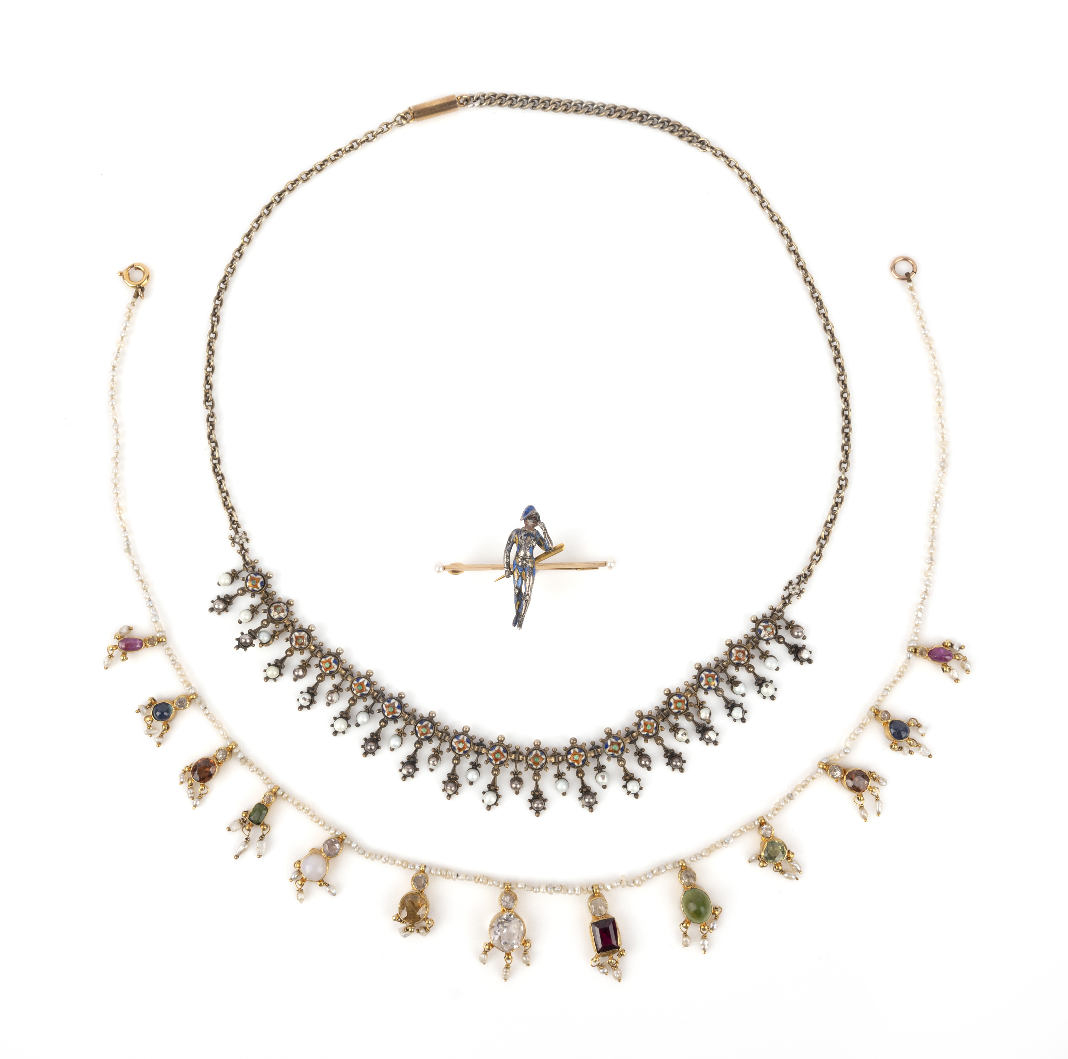 A group of two necklaces and a brooch, comprising: a brooch designed as a harlequin figure in blue and yellow enamel, to a gold bar brooch tipped with seed pearls, length 3.8cm, a silver and enamel fringe necklace, length 45.5cm, later back chain, and a seed pearl and gem-set necklace, length 37cm
