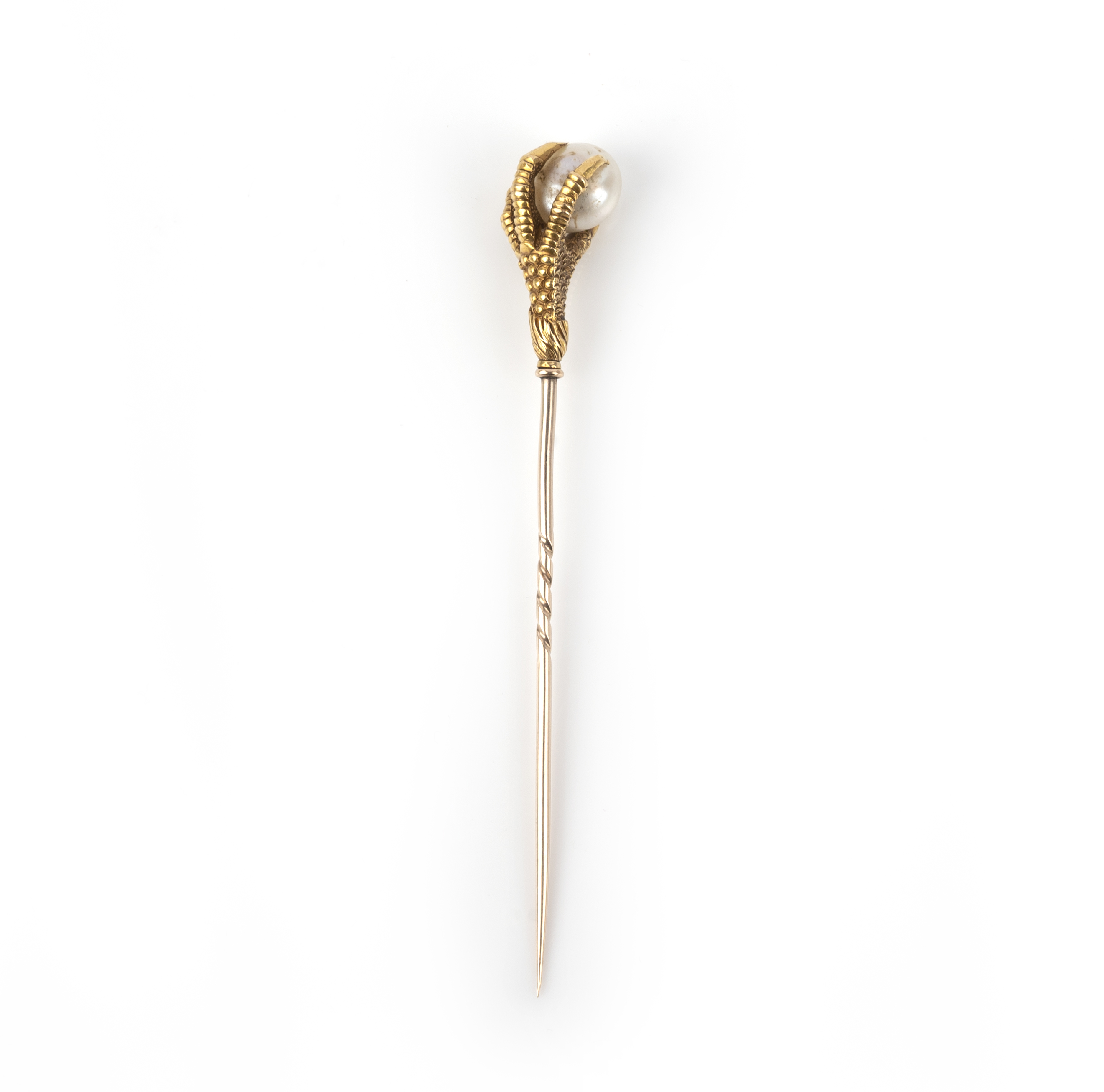 A pearl stick pin, late 19th century, designed as a bird's claw holding a pearl, mounted in gold, length 7.9cm, pearl untested