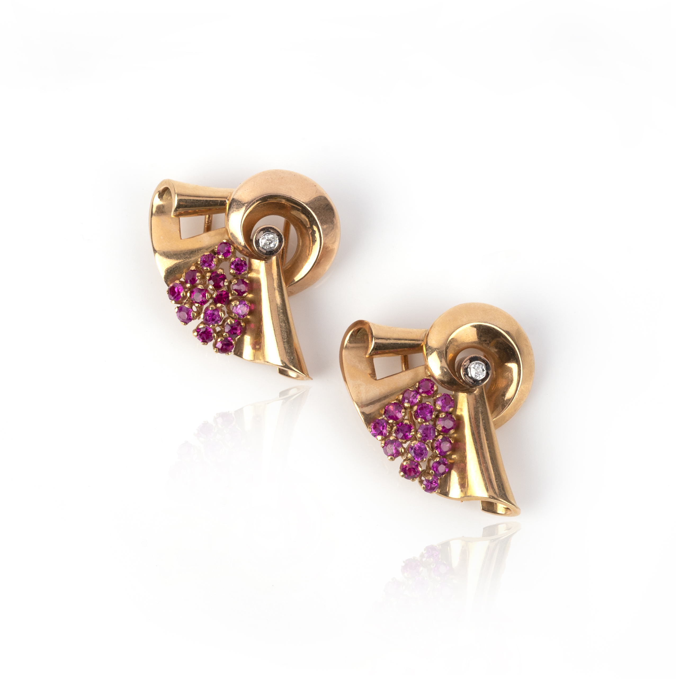 A pair of Retro synthetic ruby and diamond clip brooches, circa 1940, each of abstract scroll design, set with a circular-cut diamond and radiating lines of circular-cut synthetic rubies, mounted in gold, each measuring 3.2 x 2.9cm