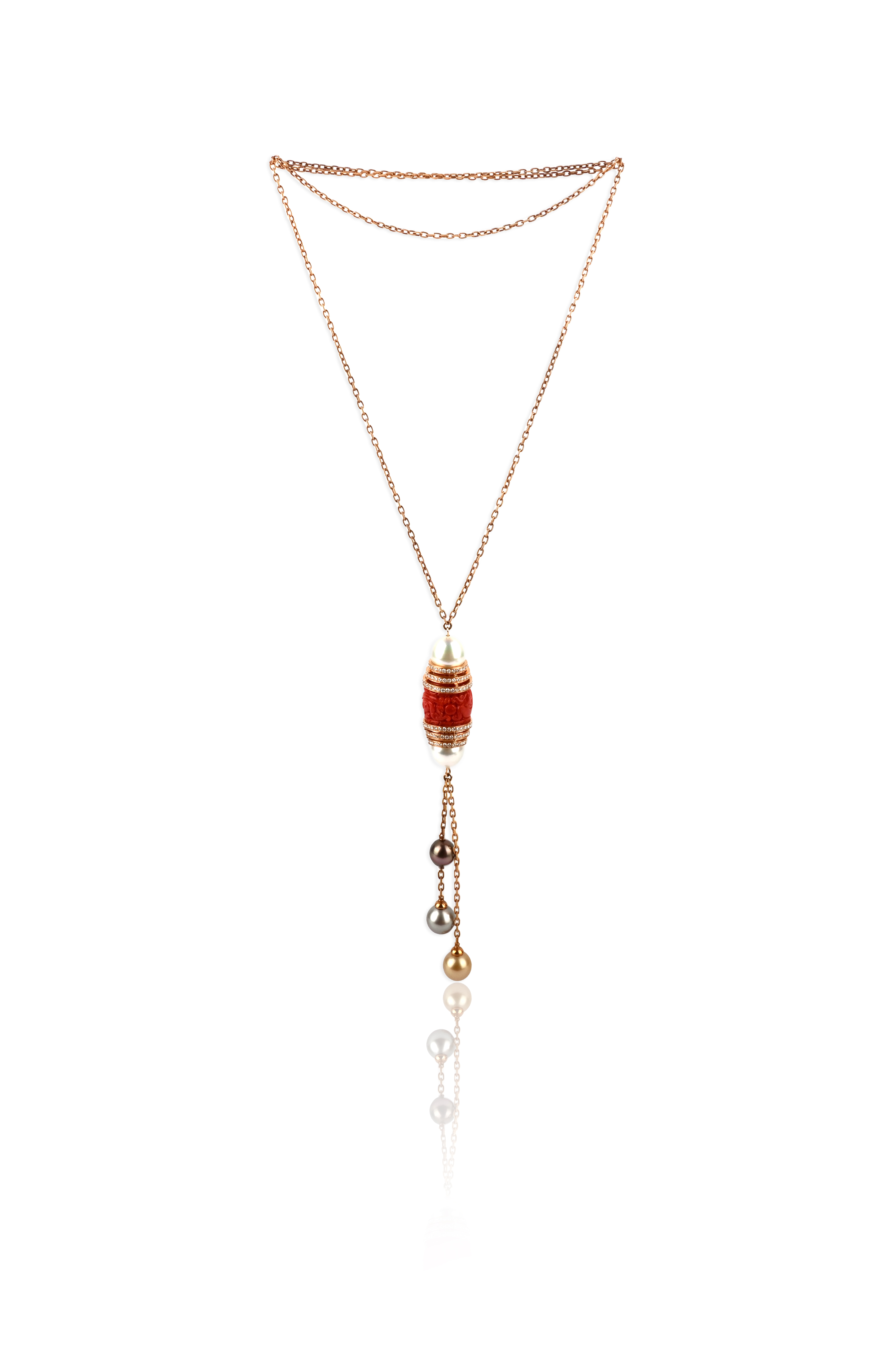 λ A coral, cultured pearl and diamond sautoir pendant