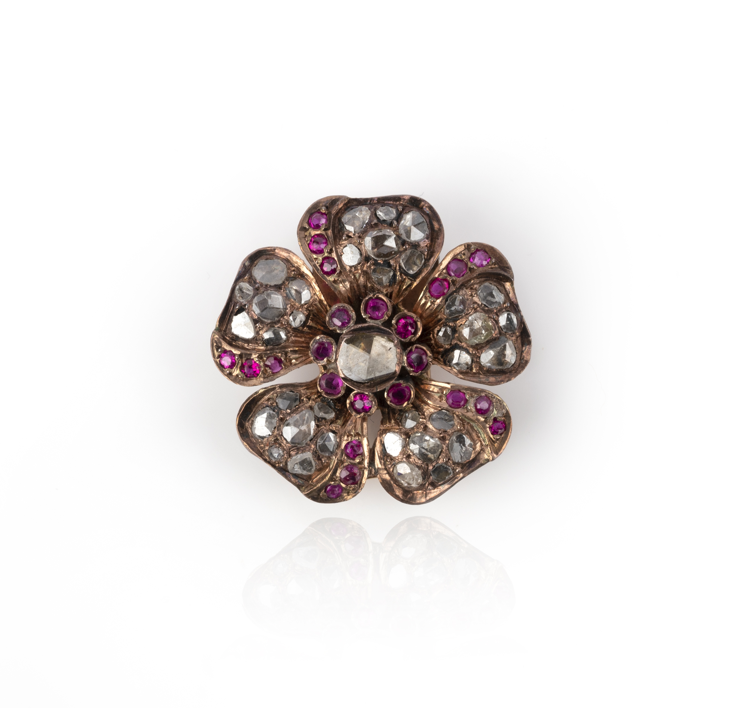 A diamond and synthetic ruby brooch, designed as a flower, set with rose-cut diamonds and synthetic rubies, diameter 3cm