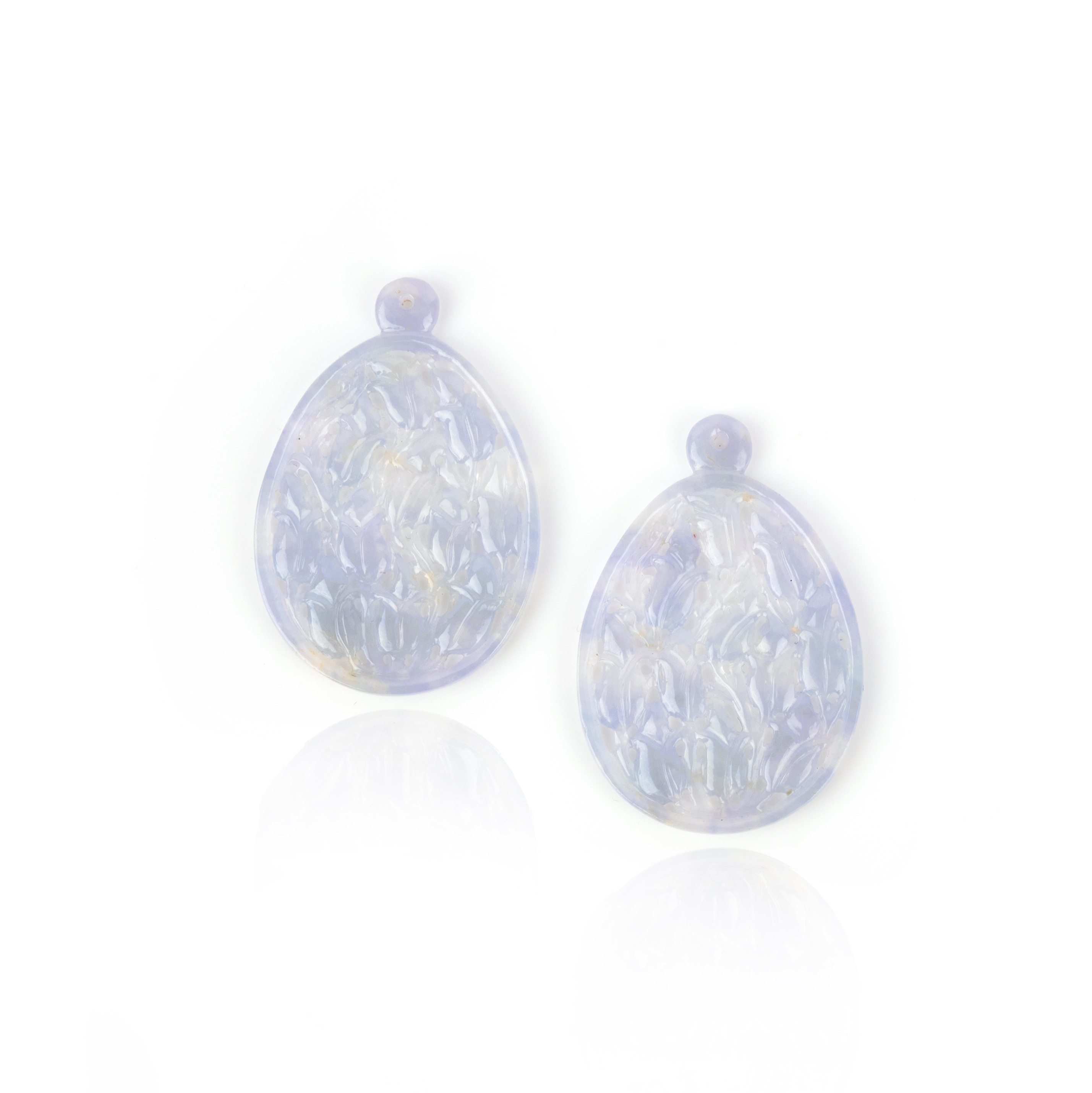 A pair of icy jadeite pendants, each translucent, pale lavender plaque of pear-shaped outline, topped by a drilled surmount, finely carved and pierced with a design of flowers, each measuring 4.5 x 3.1cm