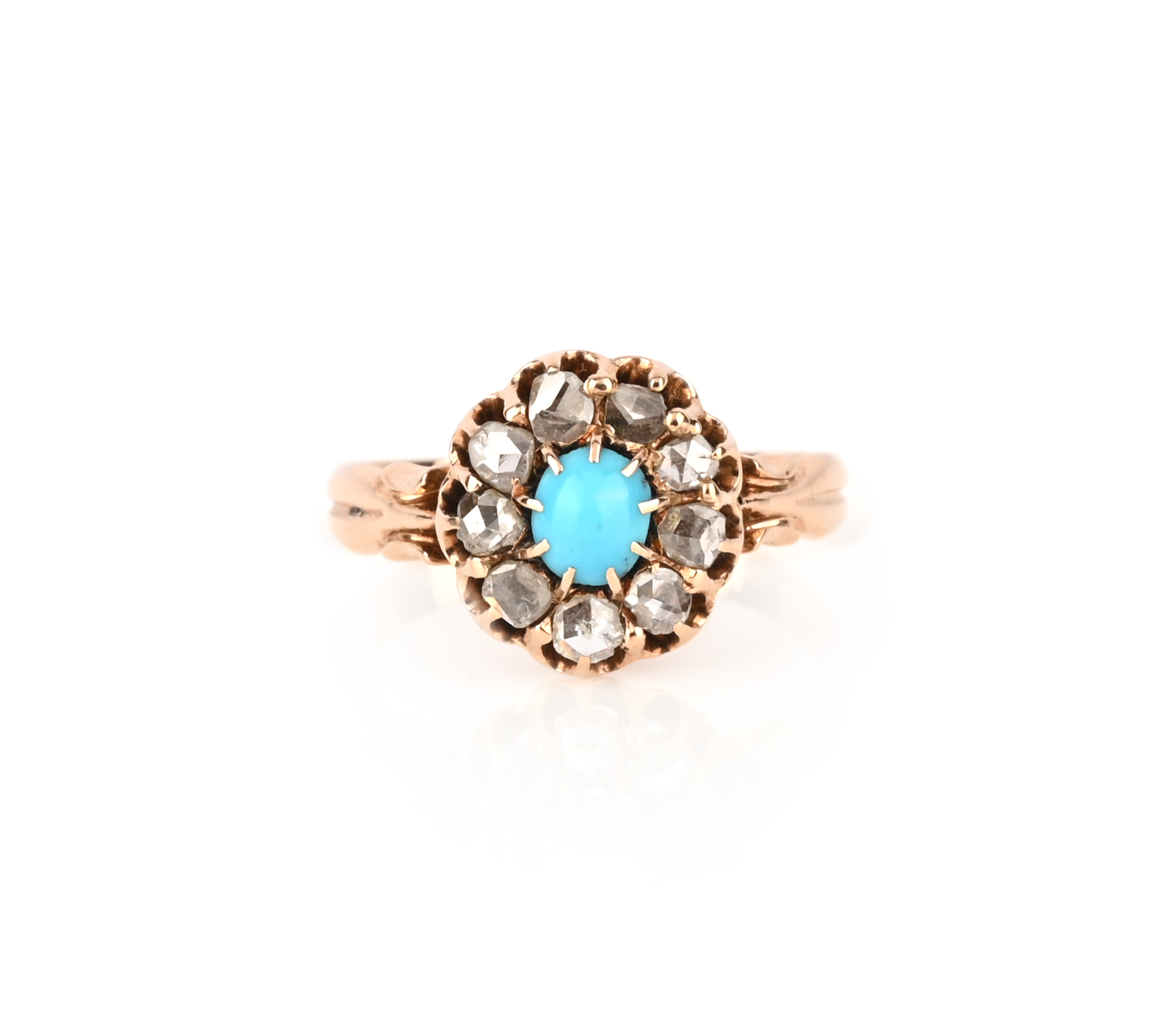 A turquoise and diamond cluster ring, the oval turquoise cabochon set within a border of rose-cut diamonds in yellow gold, size P