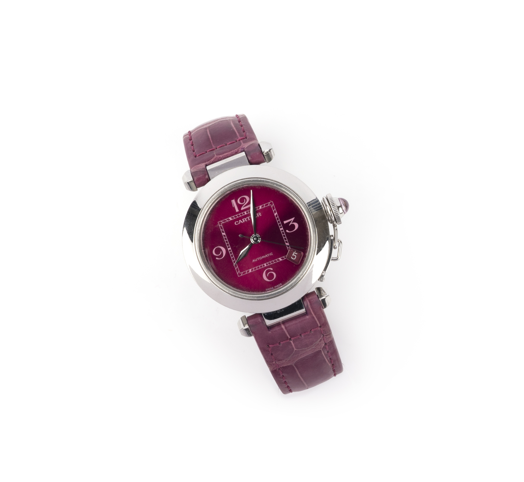 Cartier, a lady's 'Pasha de Cartier' wristwatch, the signed pink dial with date aperture, sweep seconds hand, automatic movement, steel case signed and numbered 925594UF, on Cartier leather band with steel deployant clasp, case 3.6cm wide excluding winder, in Cartier leather box