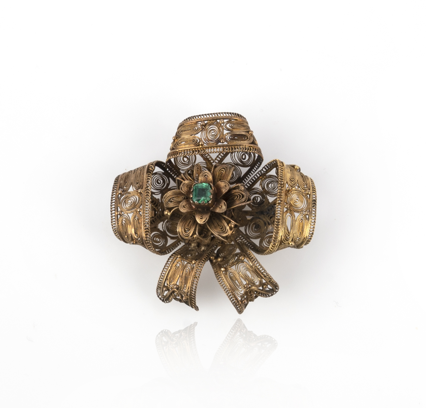 A Georgian gold and emerald locket brooch, early 19th century, designed as a ribbon bow intricately constructed from gold filigree, the central floral motif set with a step-cut emerald, the reverse with a glazed locket compartment for hair, length 3.7cm