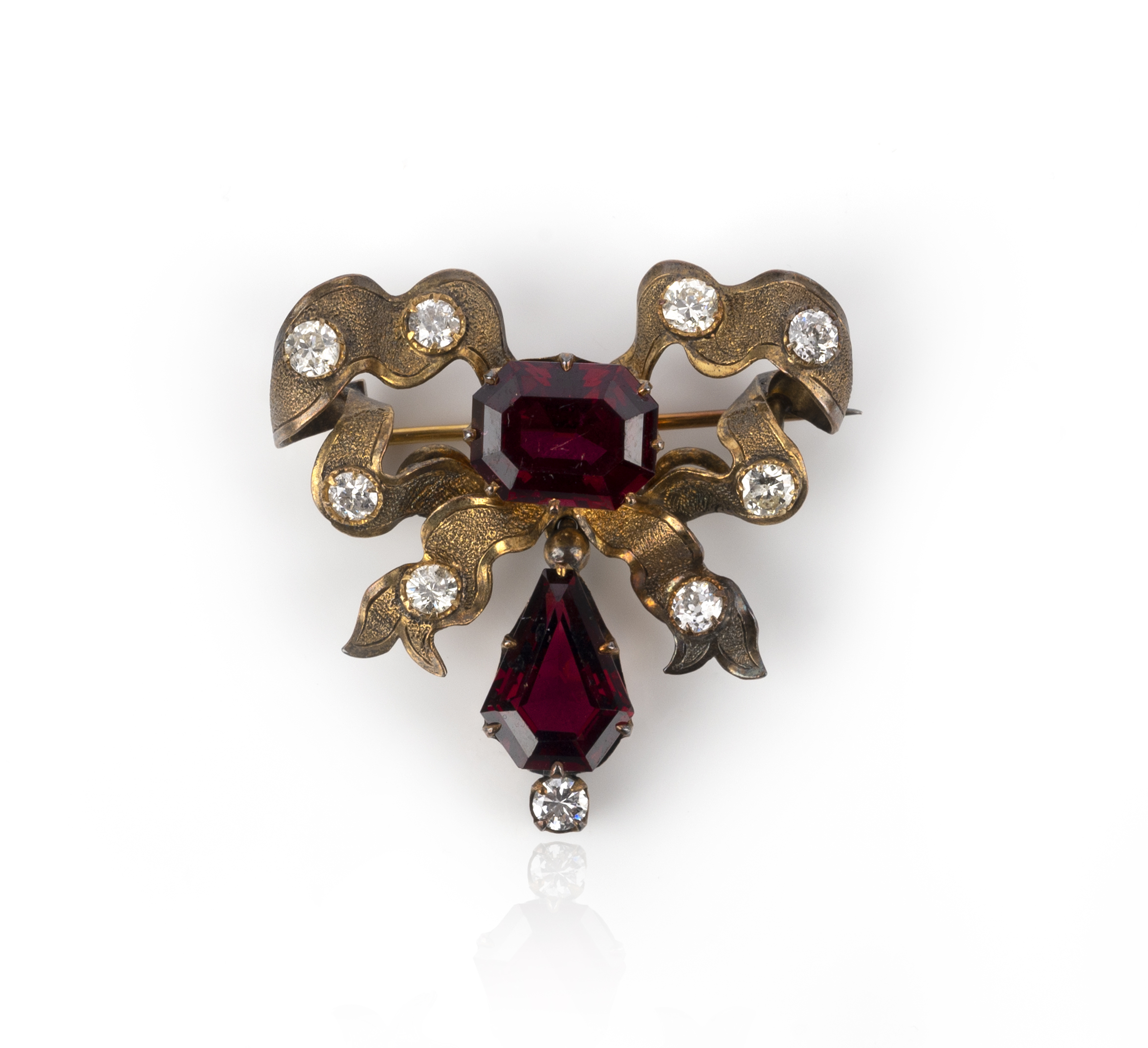 A garnet and diamond brooch, designed as a ribbon bow, set with a step-cut and a pear-shaped garnet and circular-cut diamonds, length 3.4cm