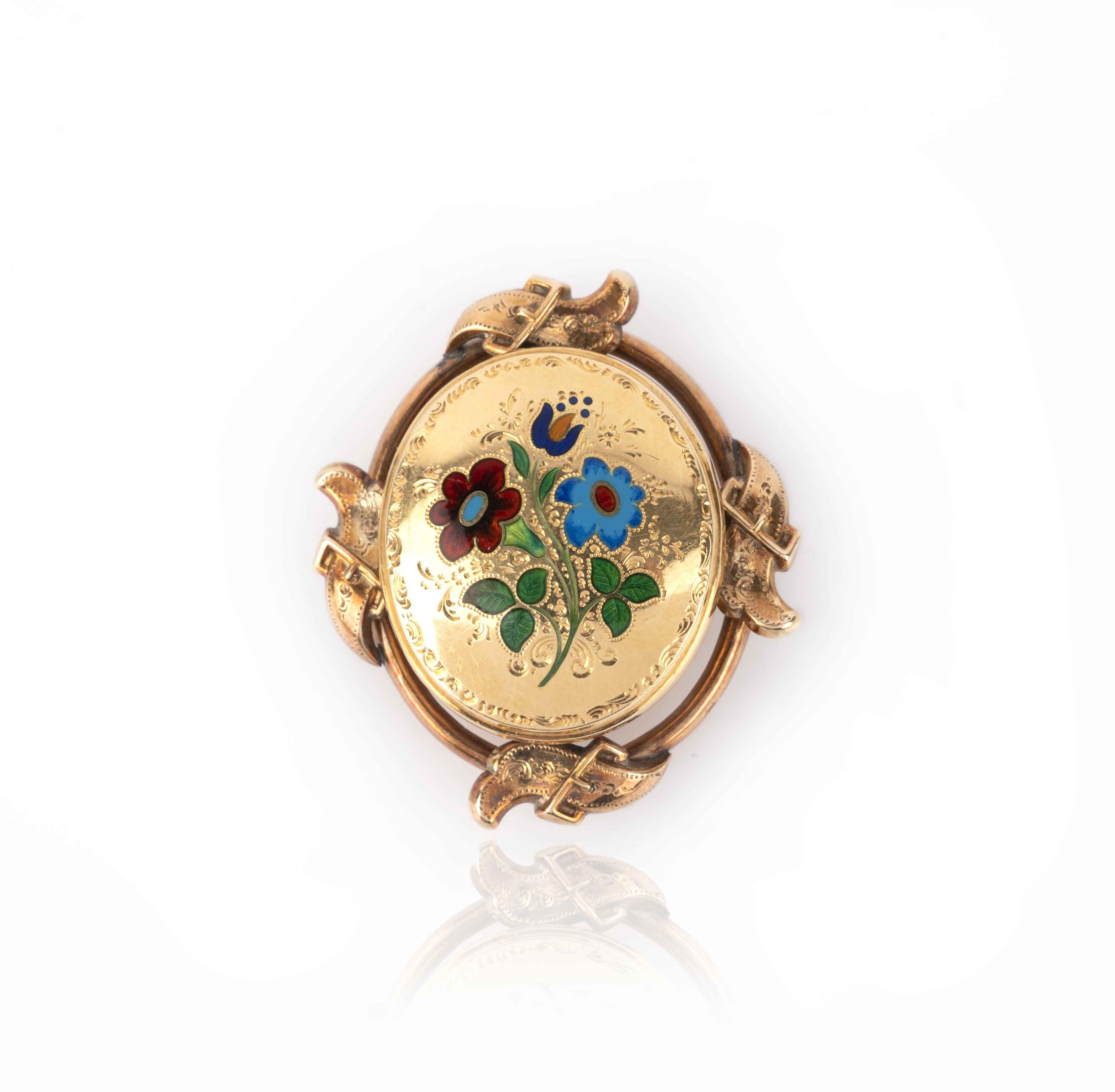 A Victorian gold and enamel locket brooch, the polychrome enamel depicting a posy of flowers covering a hinged and glazed locket compartment in yellow gold, height 4cm