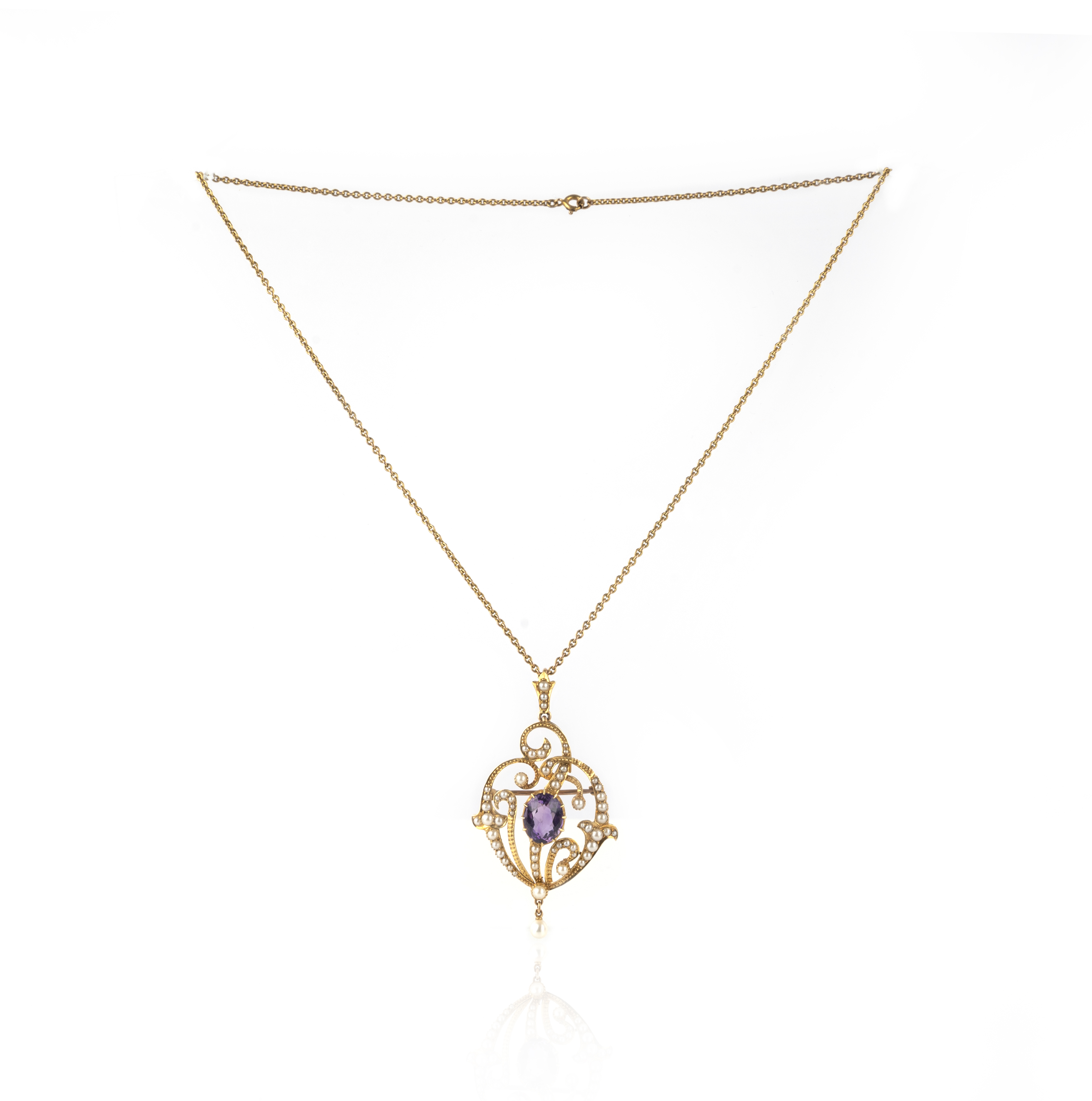 An Edwardian amethyst and seed pearl pendant, circa 1910, of asymmetrical design in the Art Nouveau style, set with half seed pearls and suspending a pearl pendant, centring on an oval amethyst, the reverse inscribed EP HP and dated 1910, to a fine gold chain, pendant with brooch fittings, length 5.3cm including bail, chain length 43cm, pearls untested, case