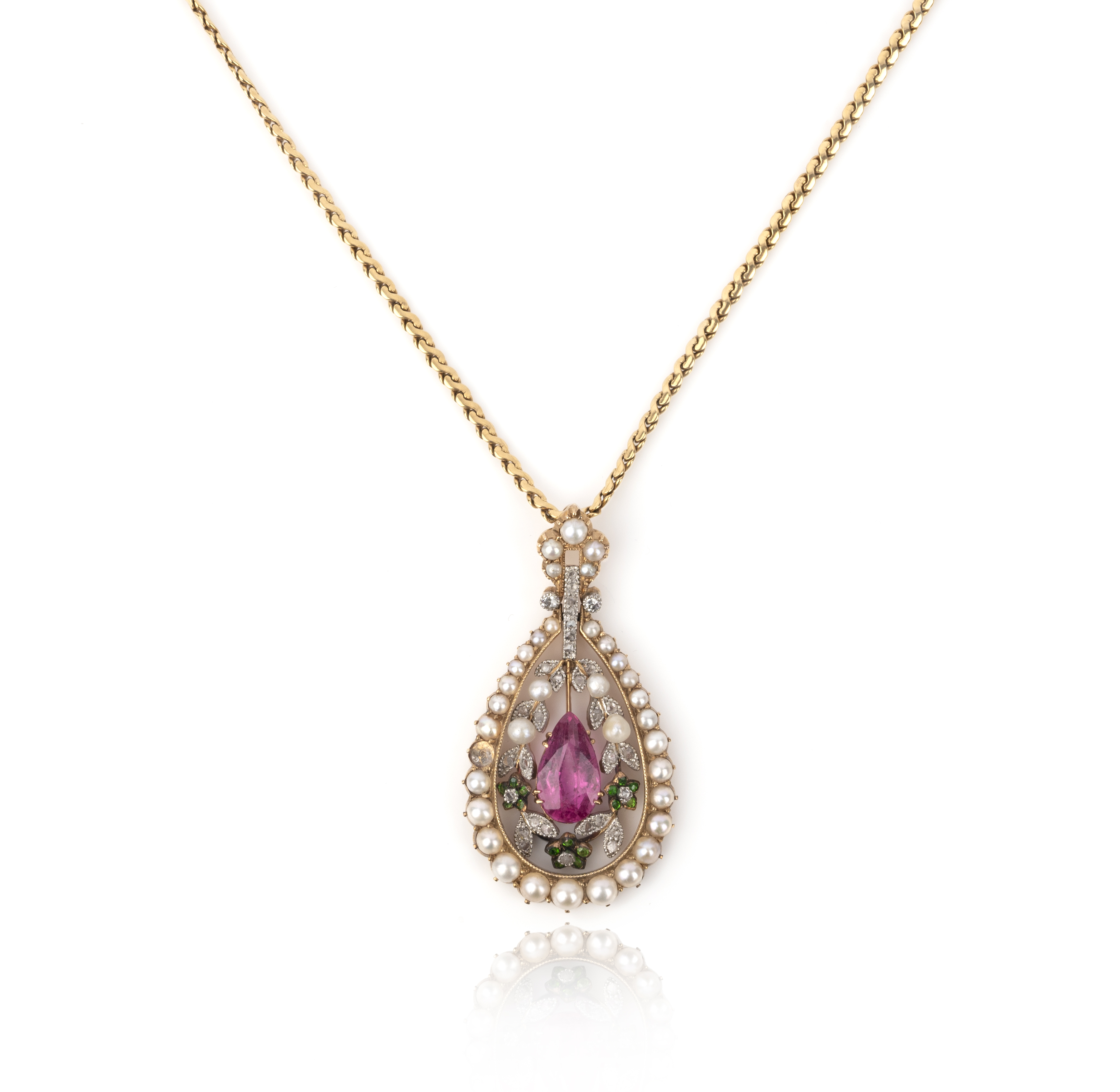 A pink tourmaline, demantoid garnet, seed pearl and diamond pendant, circa 1910, the drop-shaped pendant set with a pear-shaped pink tourmaline within a wreath of rose-cut diamonds and circular-cut demantoid garnets, bordered by half pearls, mounted in gold and platinum, pendant length 3.9cm, to a later gold chain, length 54cm, Italian maker's marks