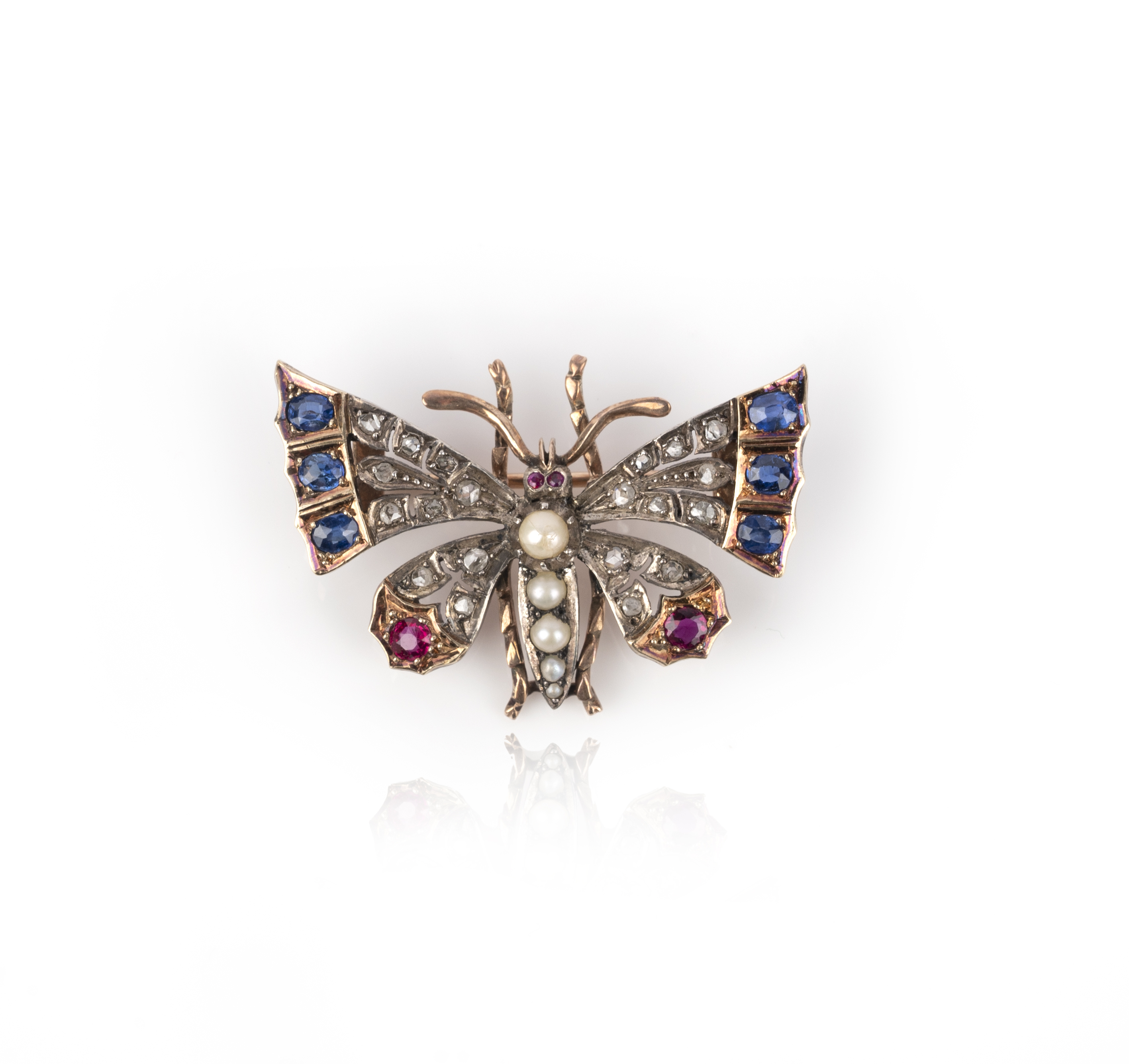 A gem-set brooch, late 19th century, designed as a butterfly, set with circular-cut sapphires and rubies, rose-cut diamonds and pearls, mounted in silver on gold, wingspan 3.6cm