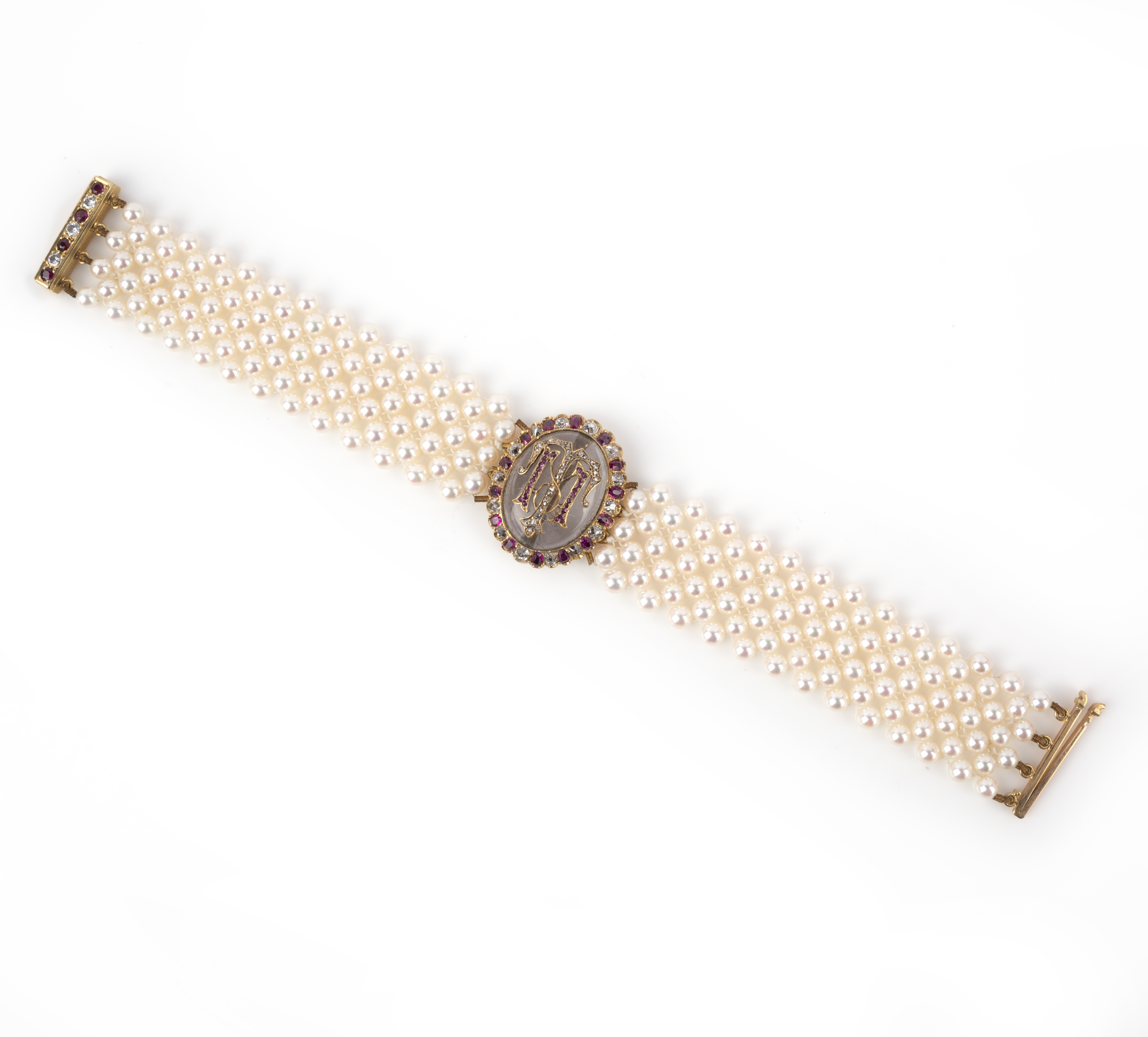 A ruby, rock crystal, diamond and cultured pearl bracelet, 19th century and later, centring on an oval cabochon rock crystal inset with the initials TM set with rose-cut diamonds and rubies, within a border of cushion-shaped rubies and diamonds, mounted in gold, the clasp similarly set, to a later cultured pearl mesh bracelet, length 17.5cm