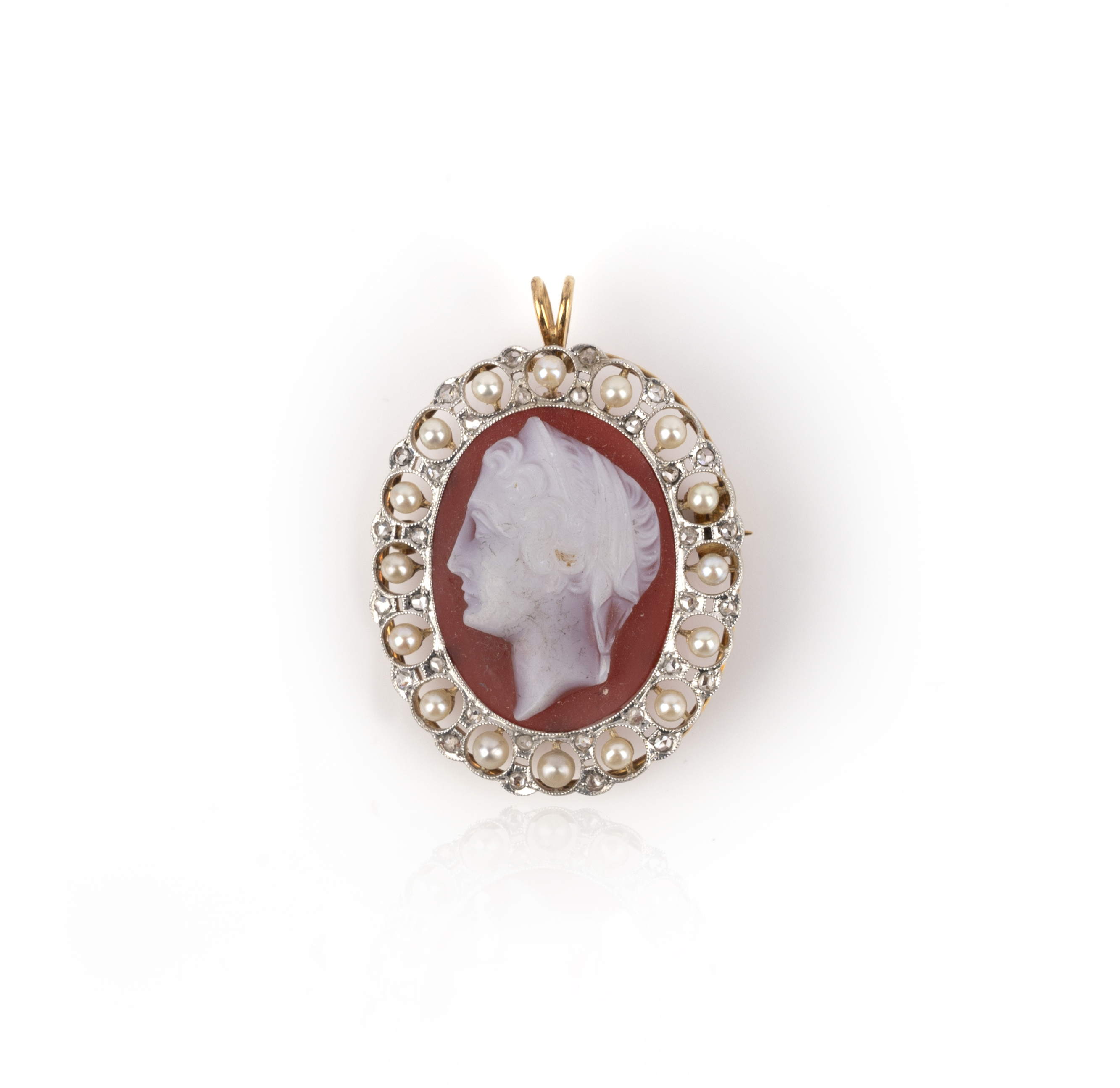 A sardonyx cameo, seed pearl and diamond pendant/brooch, early 20th century, set with an oval sardonyx cameo of a crowned woman in profile, within an open work platinum and gold frame set with seed pearls and rose-cut diamonds, length 3.6cm including bail