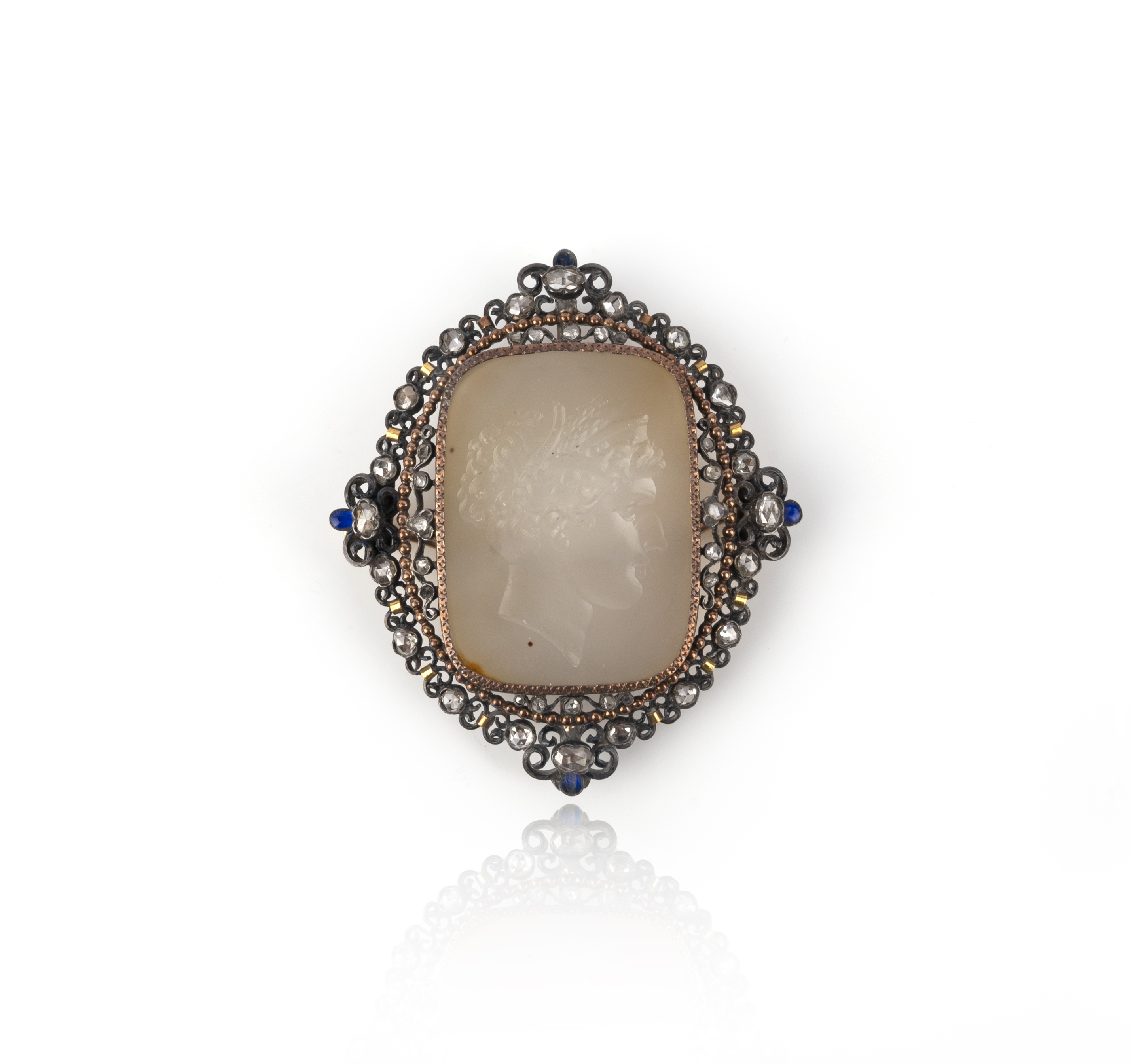 A chalcedony intaglio and diamond brooch, early 19th century, set with a section of chalcedony engraved with an intaglio of Ceres in profile, within frame of silver scrollwork set with rose-cut diamonds, accented with blue enamel, overall dimensions 6.9 x 5.9cm, intaglio 4 x 2.9cm, later brooch fitting