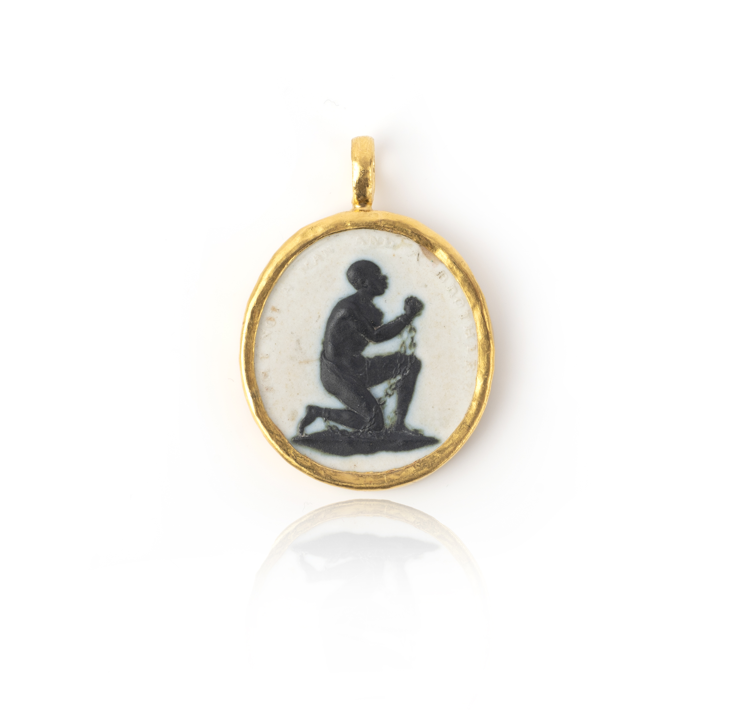 A Wedgwood jasperware cameo, circa 1790, the abolitionist-themed cameo in black and white ceramic, depicting a kneeling African slave, his hands and feet in chains, a motto reading 'Am I not a Man and a Brother?', to a plain gold mount, length 3.9cm including bail