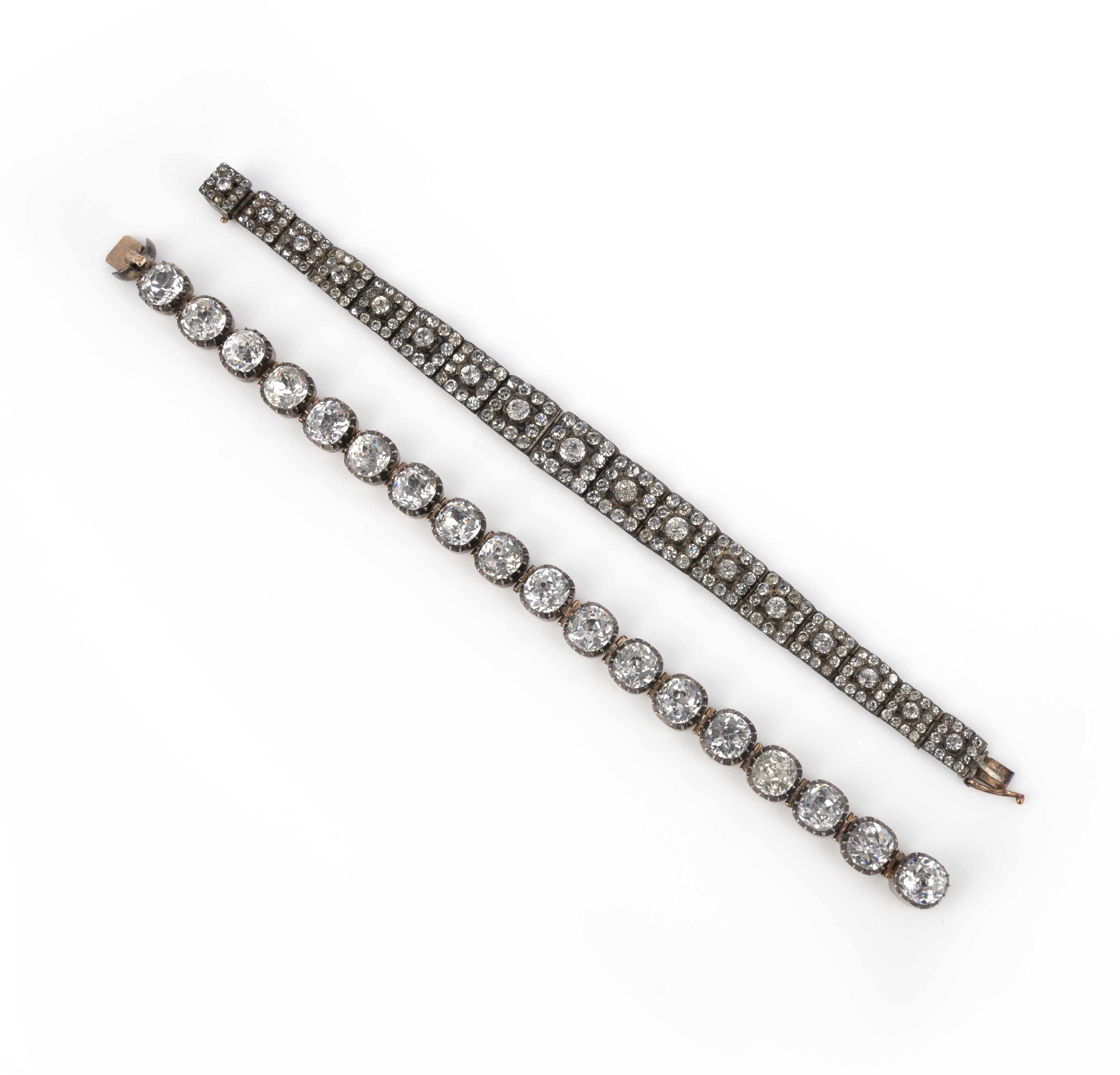 Two paste bracelets, circa 1800, comprising: a bracelet designed as a line of cushion-shaped pastes in closed-back foiled settings, mounted in silver, length 18cm; and a bracelet composed of graduated panels set with circular-shaped pastes, mounted in silver, length 17cm