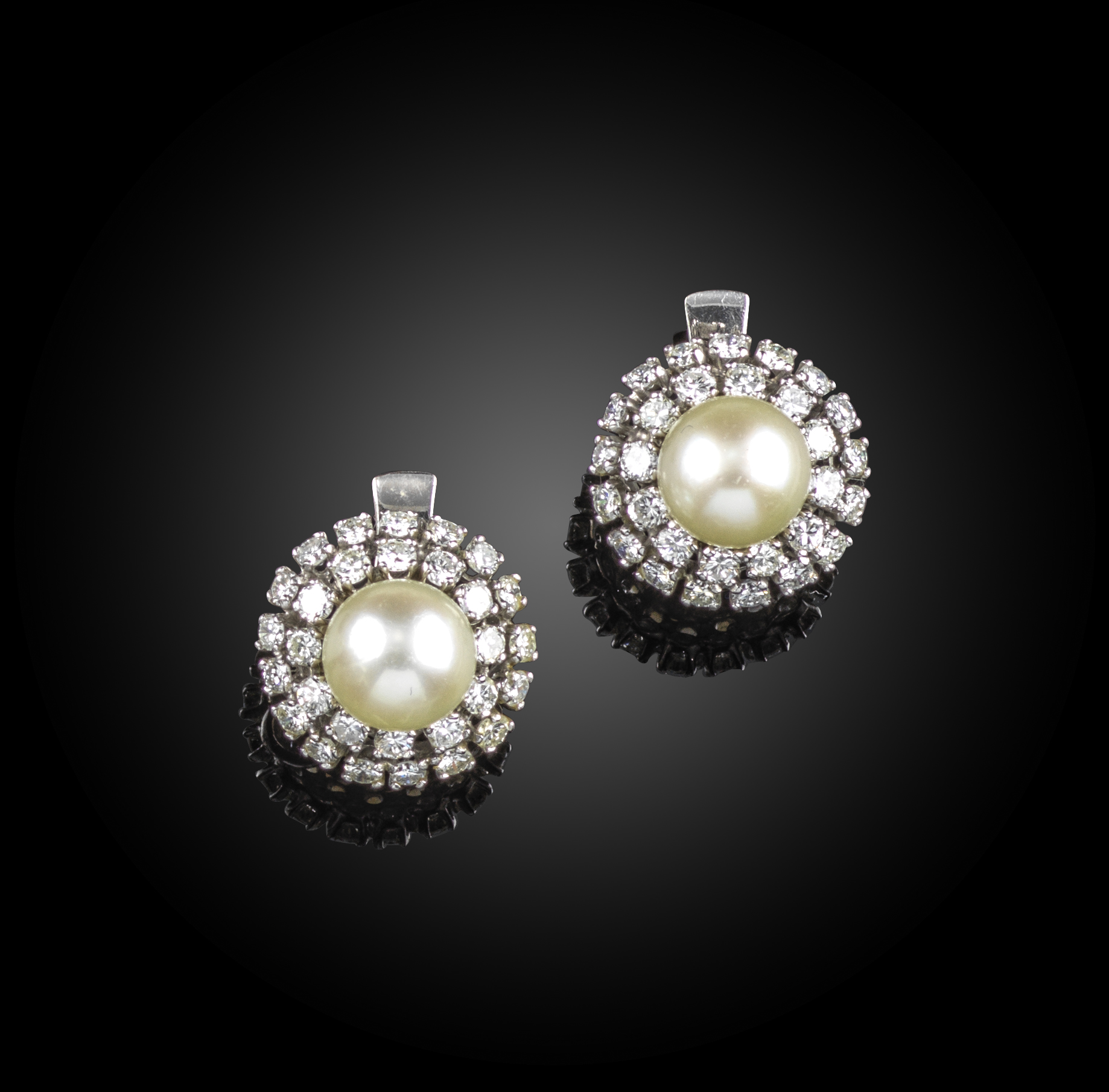 A pair of cultured pearl and diamond cluster earrings, the pearls set within radiating surround of round brilliant-cut diamonds in white gold, post fittings, diameter 16mm, Chaumet box