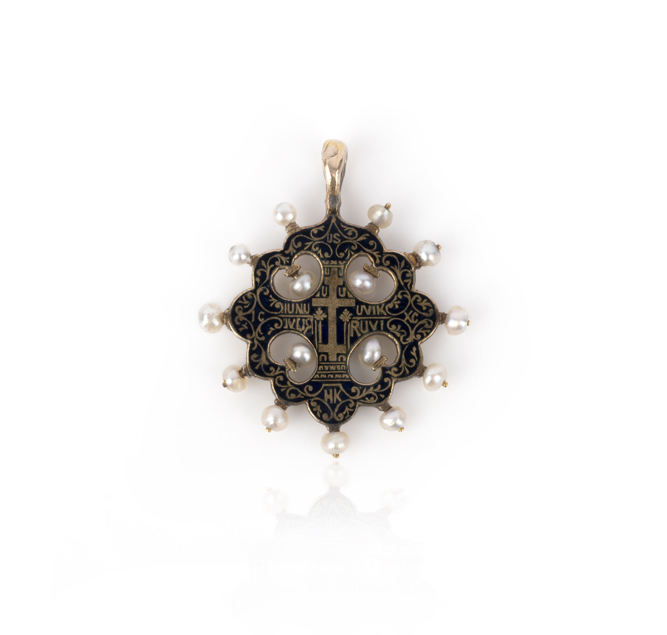 A gold, enamel and seed pearl baptismal cross pendant, Russia, 19th century, the cross pendant with lily-shaped arms finely enamelled in black, with an Orthodox cross, floral scrolls and lettering in reserve, accented by seed pearl borders, length 2.7cm including bail