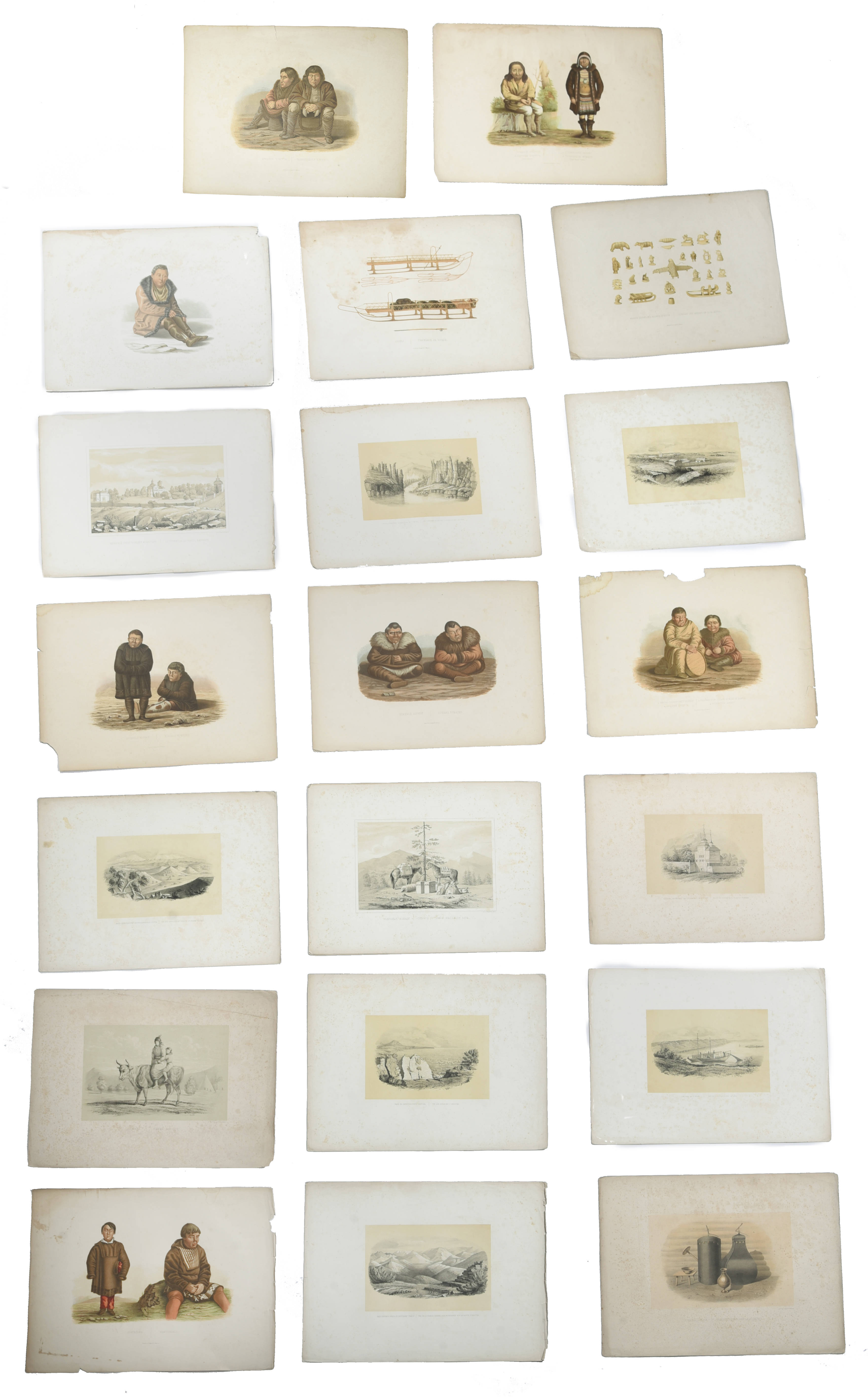 including depictions of walrus bone Koraik works, sleds, a convent, Lena river scenes, view of Irkutsk, and people from the differing ethnic groups; Koriak, Tungus, Choutcha, ten coloured,