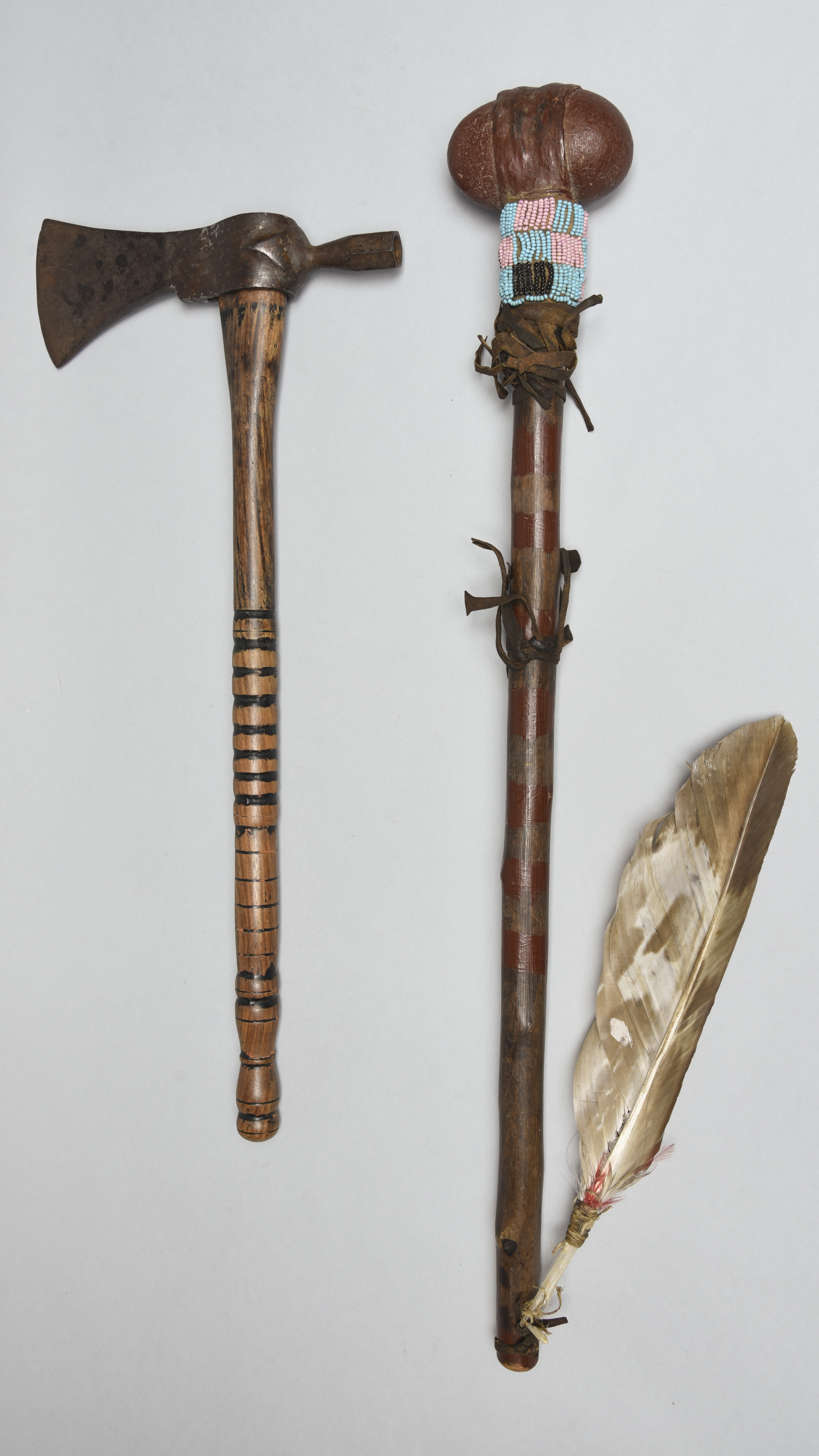 and a pipe tomahawk, with a cast iron blade and a part ribbed shaft with remains of pigment, 48cm long. (2)