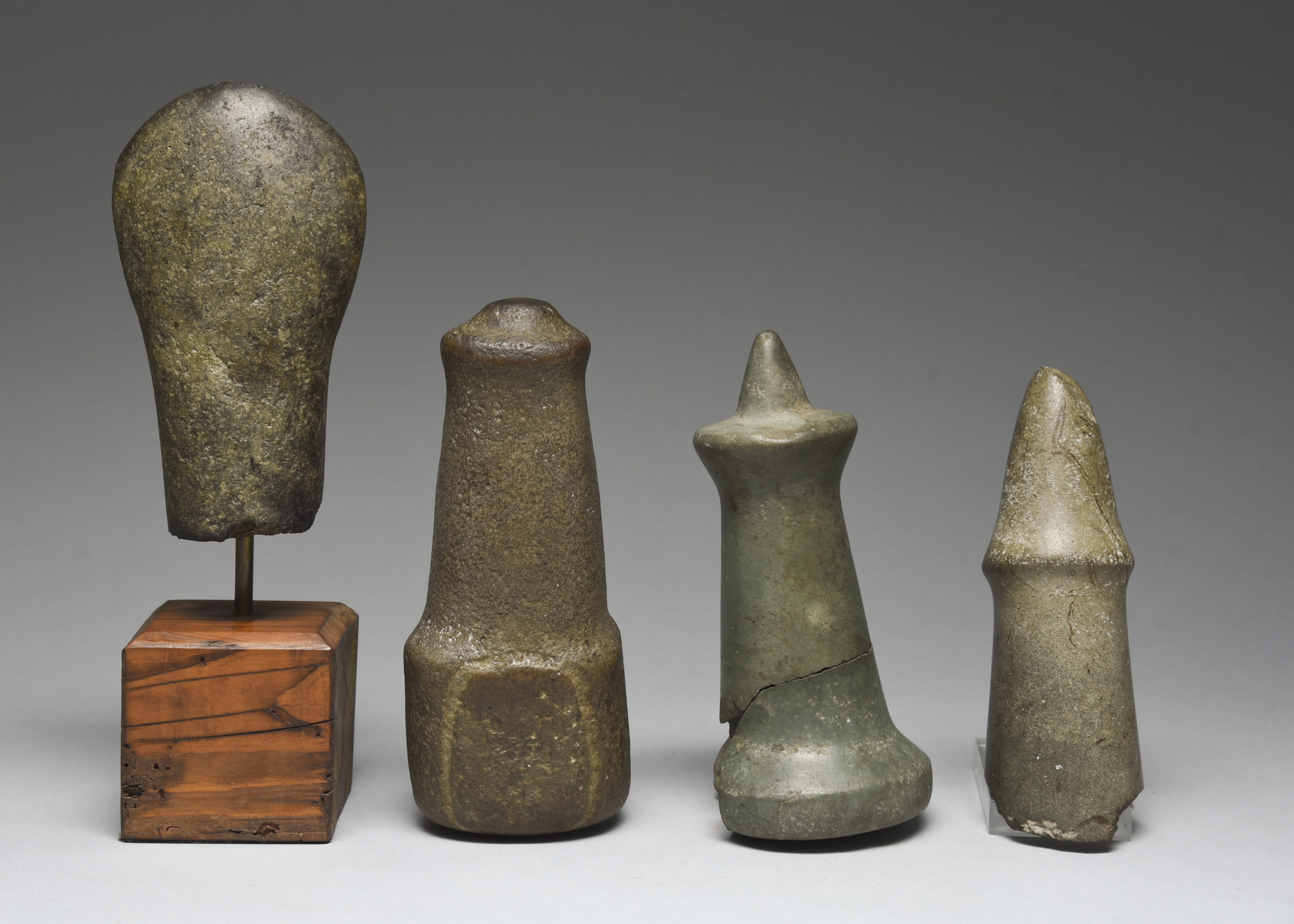 a Salish greenstone maul, broken, 18.5cm high, a fragment stone maul, 17.5cm long and a greenstone axe head fragment, 16cm long, on a stand. (6)