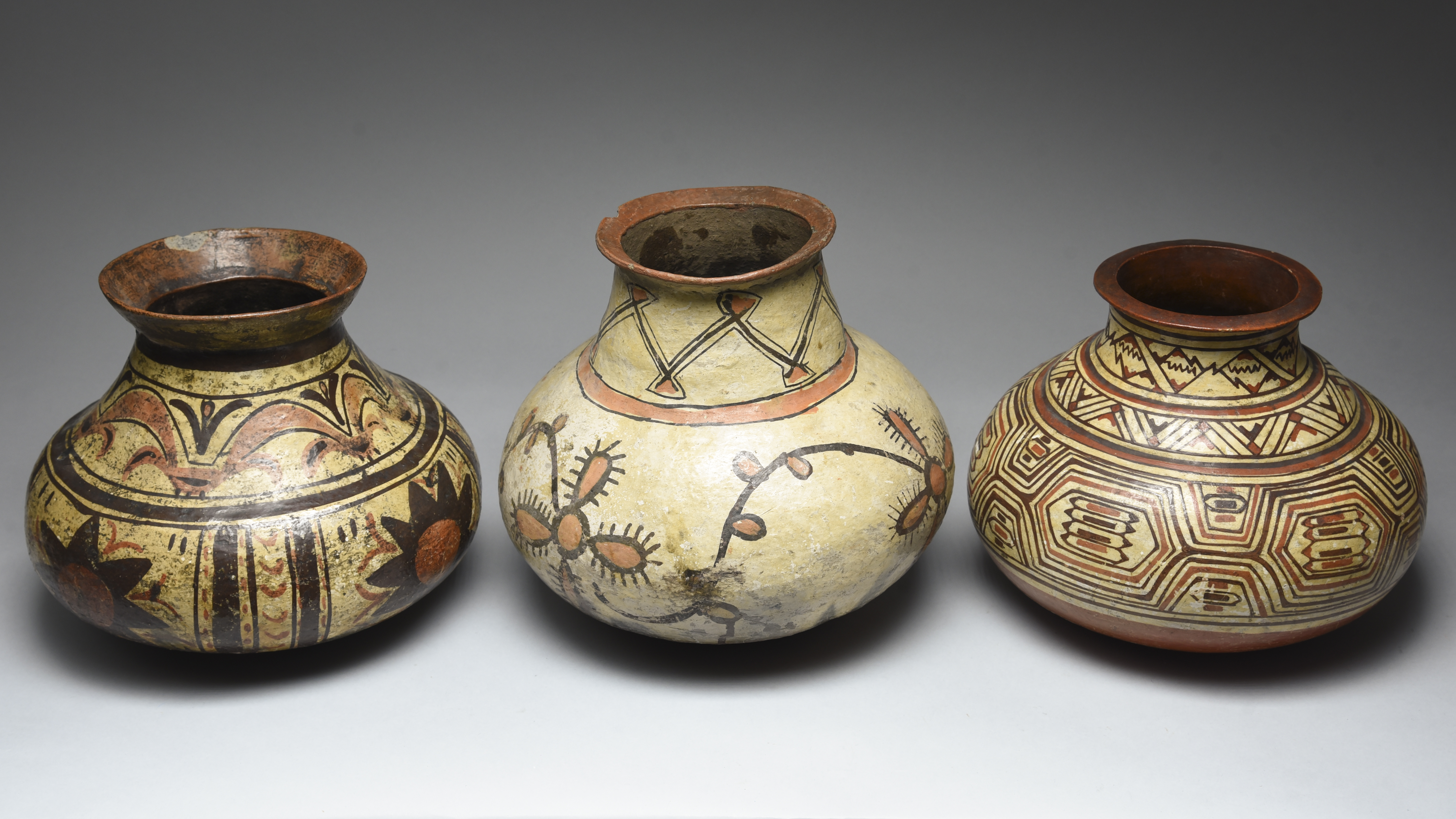 with polychrome decoration, including cacti and flowerheads / suns and one Shipibo with geometric decoration,