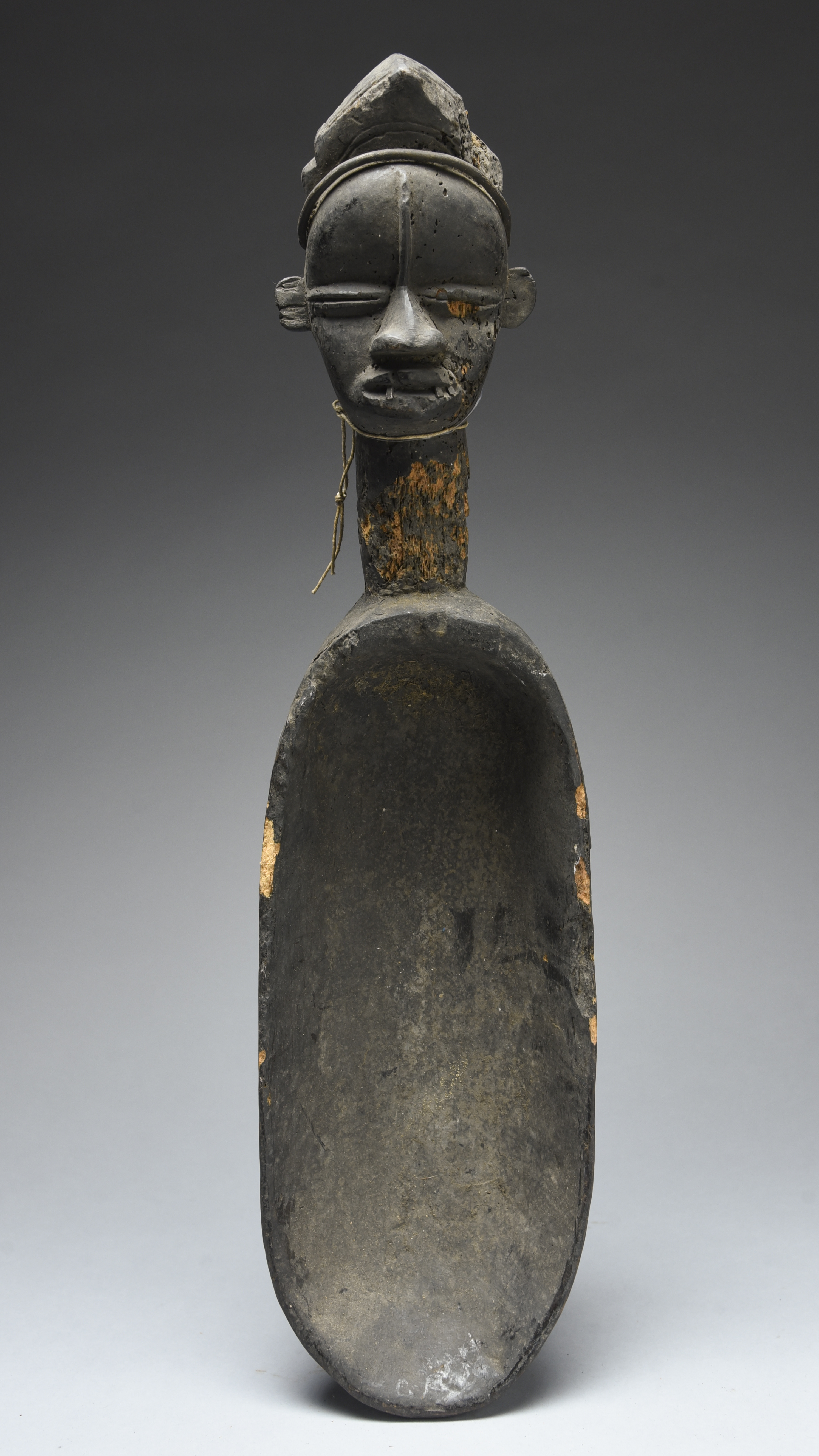 with a head finial having metal teeth and a metal band over the forehead, the back of the bowl with two carved chevron bands,